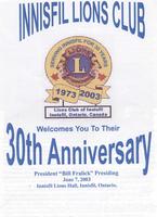 Copy of the Innisfil Lions Club 30th Anniversary Brochure bearing the Lions Club logo and the text "Innisfil Lions Club, IHS4079