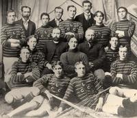 Group photo of the Cookstown Lacrosse team in an unknown year. The players are wearing matching white striped turtleneck,