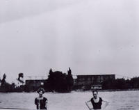 Connie Wisker (right) plus unknown, in water at Government pier, Bell Ewart. Part of old ice house in background., IHS3642