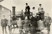 Photo of Mr. and Mrs. George quantz, taken circa 1915, with a group of nine other people gathered around a steam powered, IHS315