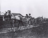 Photo of Ethel and Connie Wisker riding in a horse and buggy on a dirt road. Both women are dressed in long coats and, IHS3643