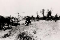 Image of a horse drawn binder. Pictured are Albert Pratt and his son., IHS2258