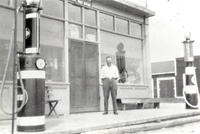 Photo of Leonard Bell standing in front of the Gilford Store and Post Office. Two early style gasoline pumps are