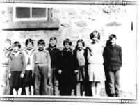 Group photo of students standing in a row in front of Nantyr School on the 7th Line in 1930. Pictured from left to right, IHS1015