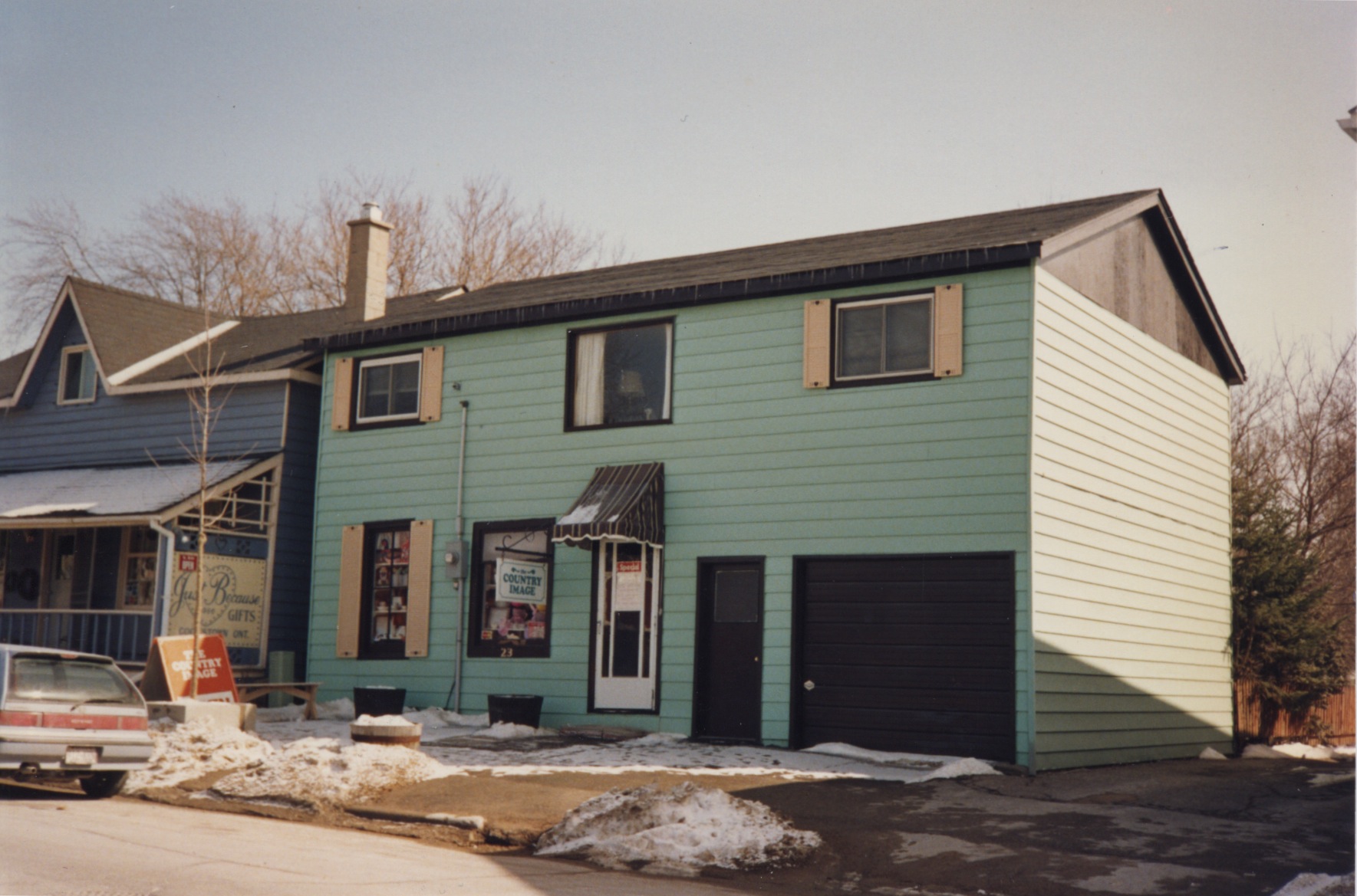 Exterior of the Country Image store on 23 Queen St. taken in 1992. The store was opened in 1986 by Jeff Spence. Previously it housed a variety of businesses including the Swan Shop, the Craft Shack, the library, Conder Sugg and Bigelow law firm, and originally the dentist's office of Dr. J.H. Miller in 1921.
