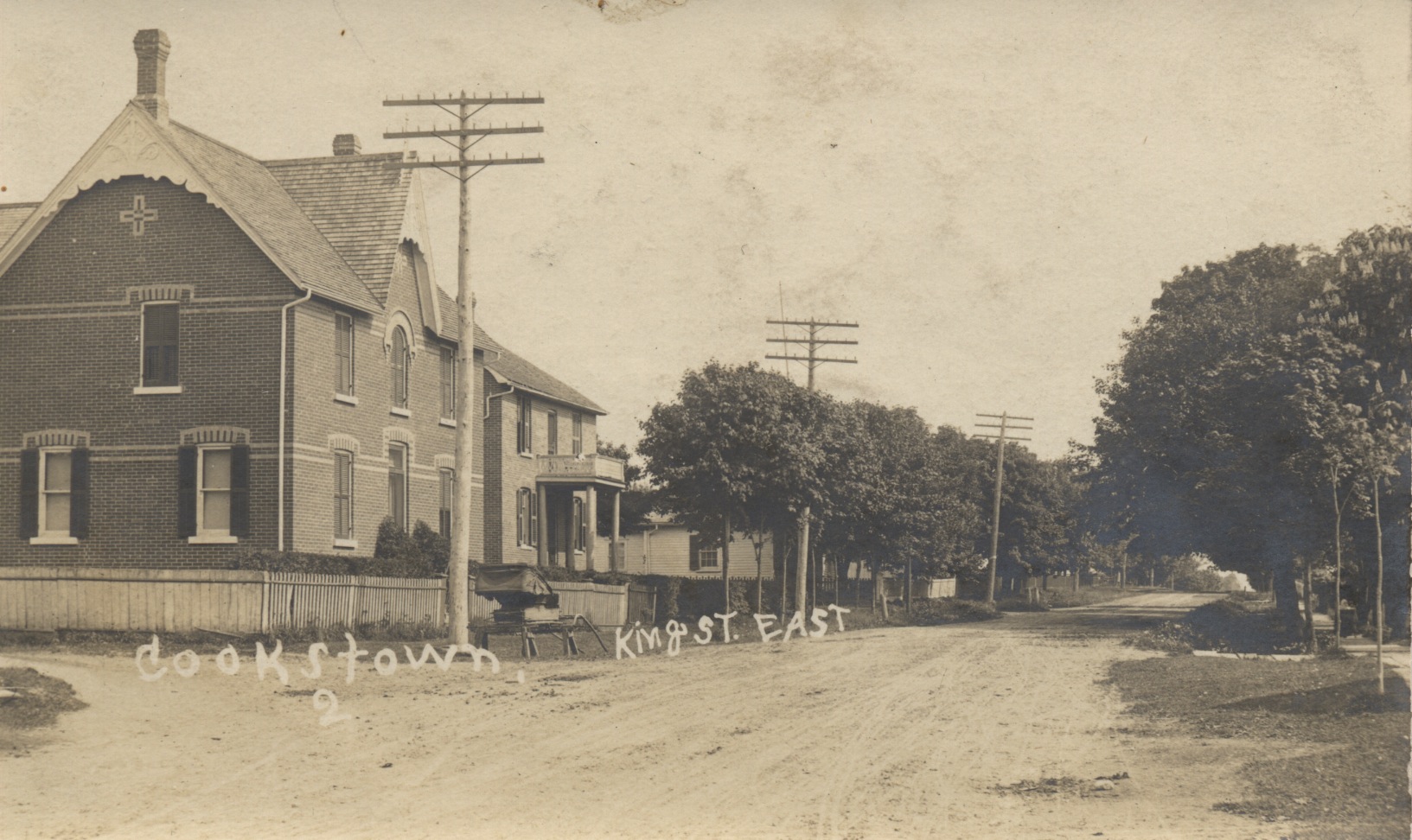 Postcard depicting King St. South in Cookstown, looking East. The date of the postcard is unknown. The image captures the dirt road lined with trees and utility poles, and offers a clear view of the home of William T. and Dinah Miners on the far left with its distinctive gable ornamentation and brick decoration.