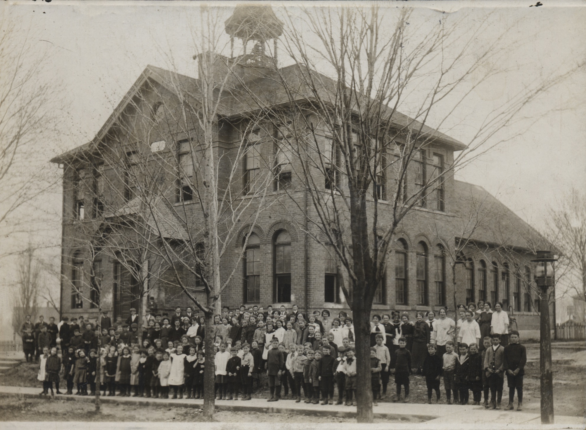 Photo of Cookstown Public School, which served as both a public and high school, with all of its considerable student body standing in front of the building in the early twentieth century. Originally it had been the location of the former Methodist Church. This two-storey building was situated on the corner of George and Wellington Streets in Cookstown. Two more rooms were added and some years later it was enlarged again. Some of the well-known pupils who attended were: Emily Ferguson Murphy, writer, teacher, and one of the first women to act as Magistrate in the British Empire; Nina Moore Jamieson, famous writer and teacher; and Kenneth Kidd, archaeologist and director in the Royal Ontario Museum. The photo clearly shows the brick building with its rounded arch windows and bell tower in either autumn or spring as the trees are leafless. The students are predominantly dressed in warm clothing, and a gas streetlamp is visible in the bottom right foreground of the photo.