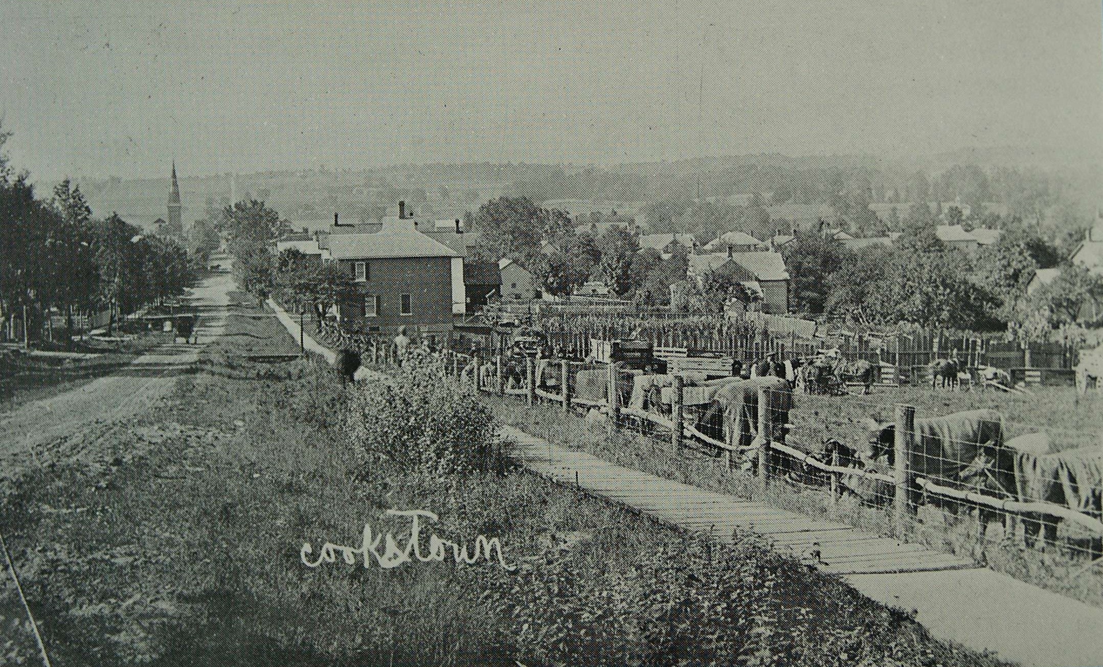 A very early view of Cookstown village looking north. The photo shows a dirt road on the left running north towards a church steeple in the distance. On the right there is a walkway made of boards running alongside a fence containing some blanket covered cattle and farming equipment, with a number of houses lining the road beyond the fence. The cows were being readied for showing at the Cookstown Fair c. 1900.
