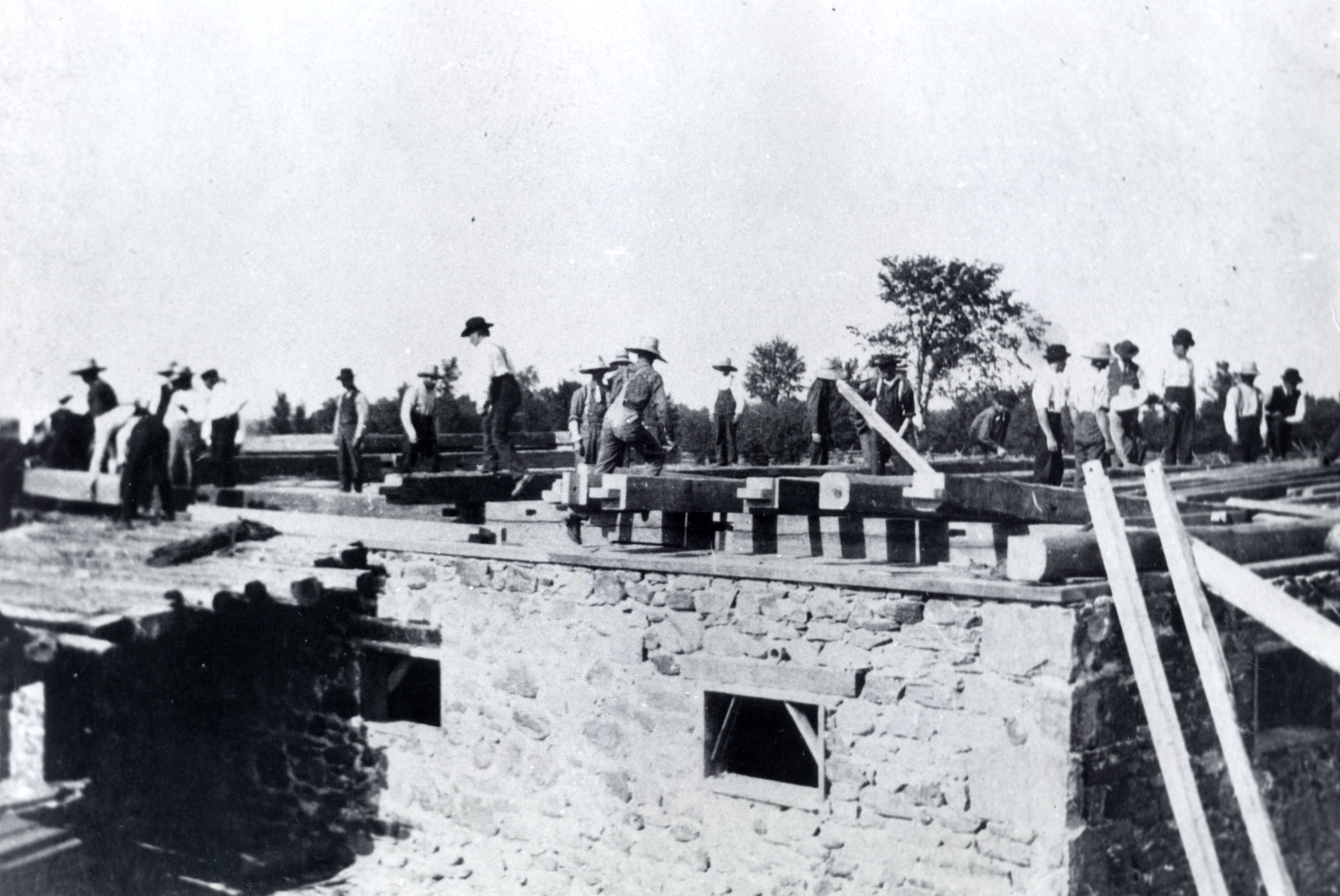 Raising of a barn with a stone foundation.