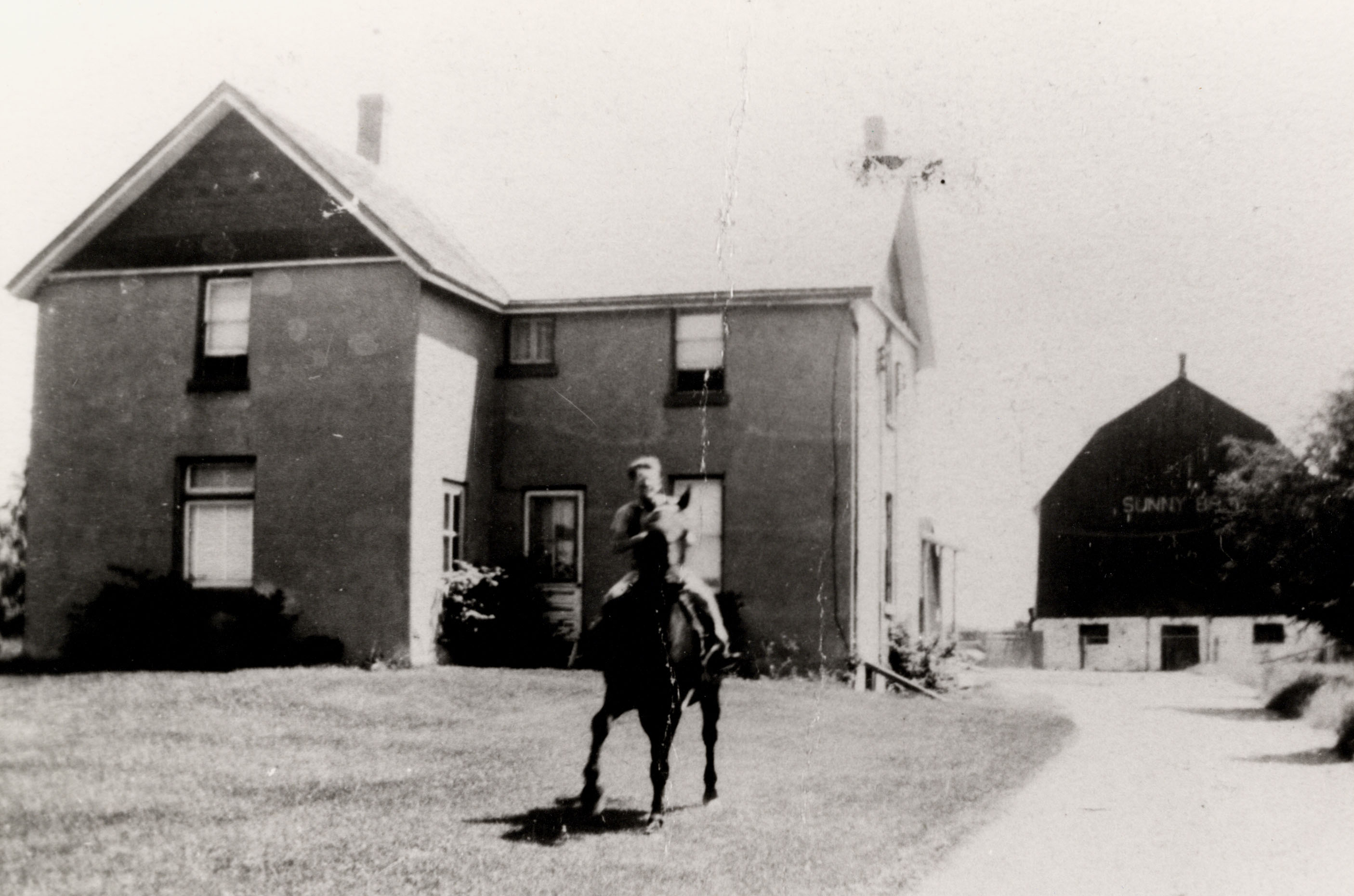 Irving Nelson on horse back with the Nelson farmhouse and barn in the background.