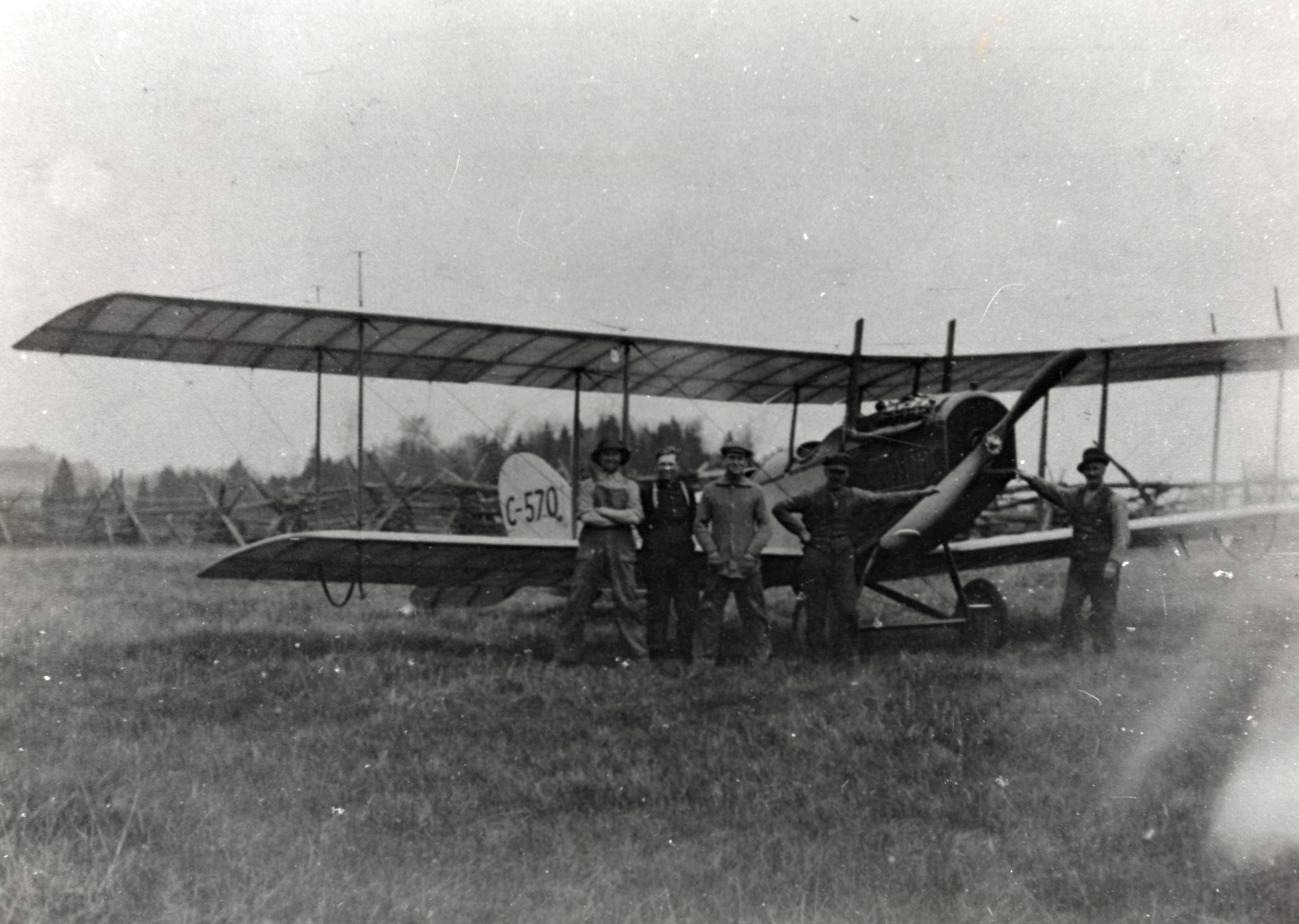 Image of an airplane that was forced to land in 1920, reason is unknown. It appears to have landed on Churchill farm land, Innisfil. Five men can be seen standing on front of the airplane's wings, posing for the photograph.Fourth from left is Frank Rogerson.