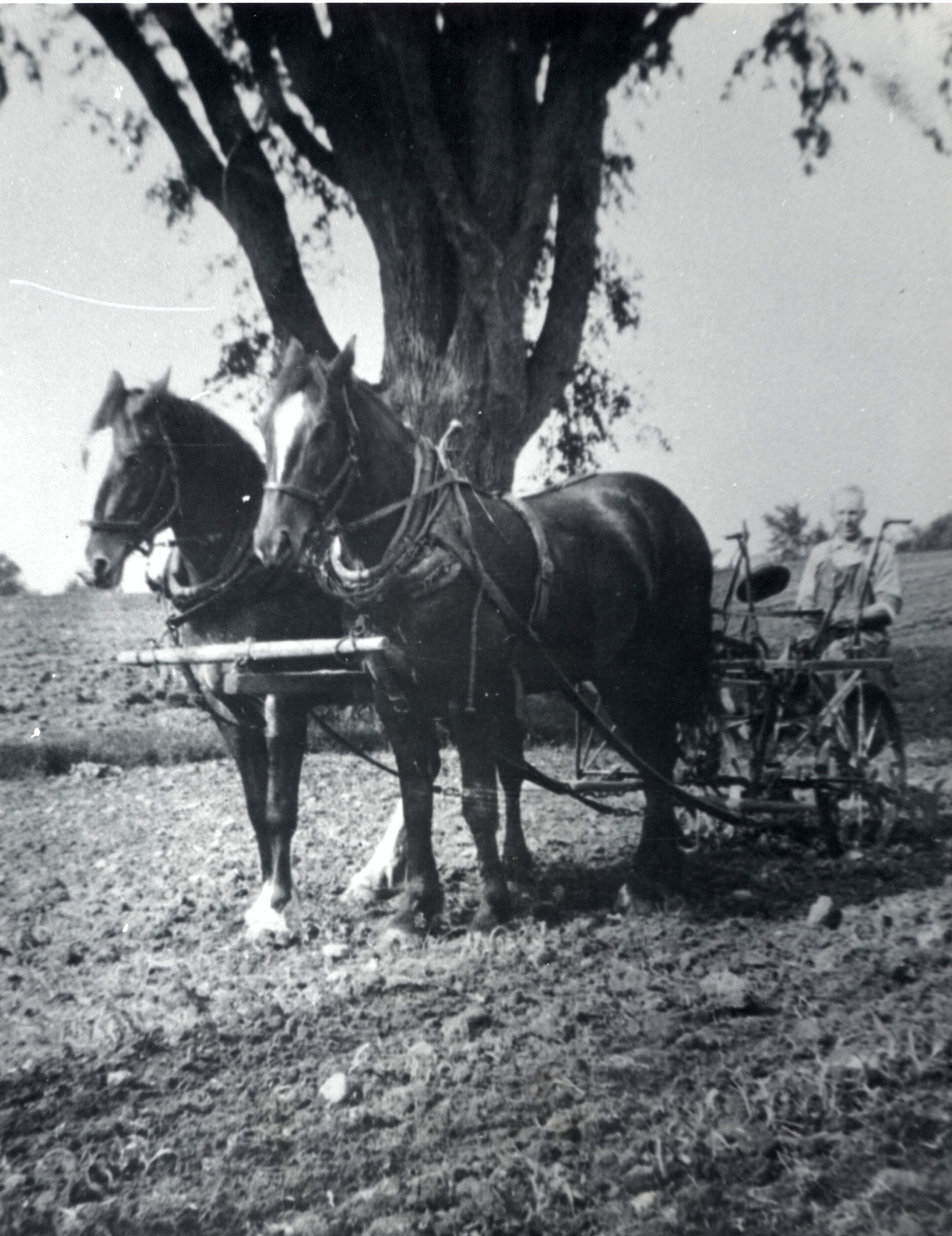 Lemuel Hubbert scuffling corn with a two-row scuffler and a team of horses.