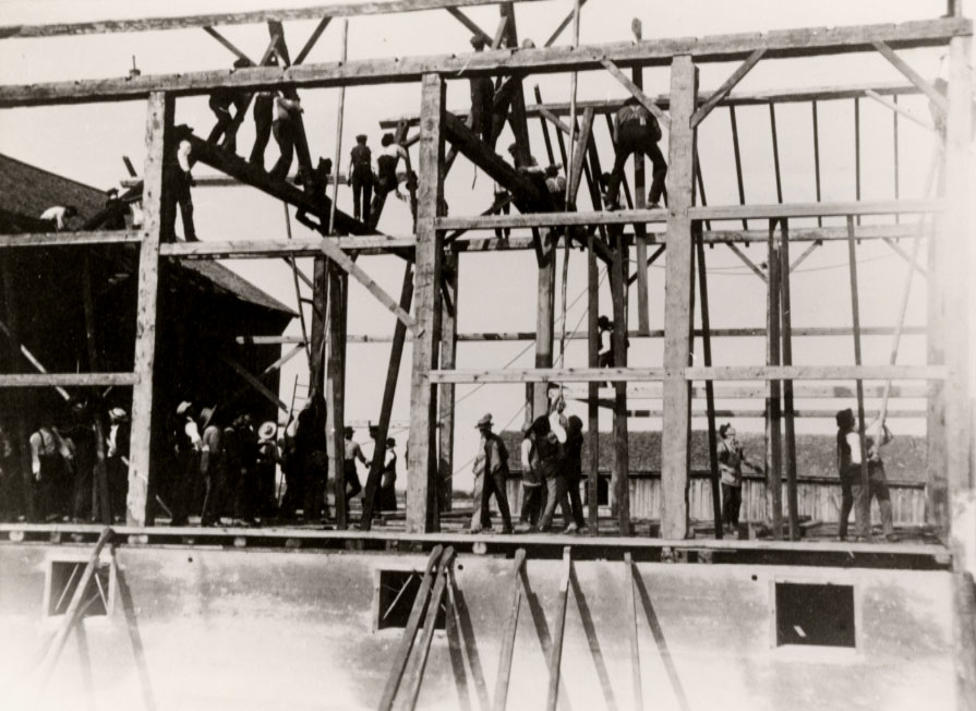 Image taken of a group of men participating in a barn raising, suspected to have been taken around 1880. Men can be seen working together raising arches and beams to create the structure of the barn.