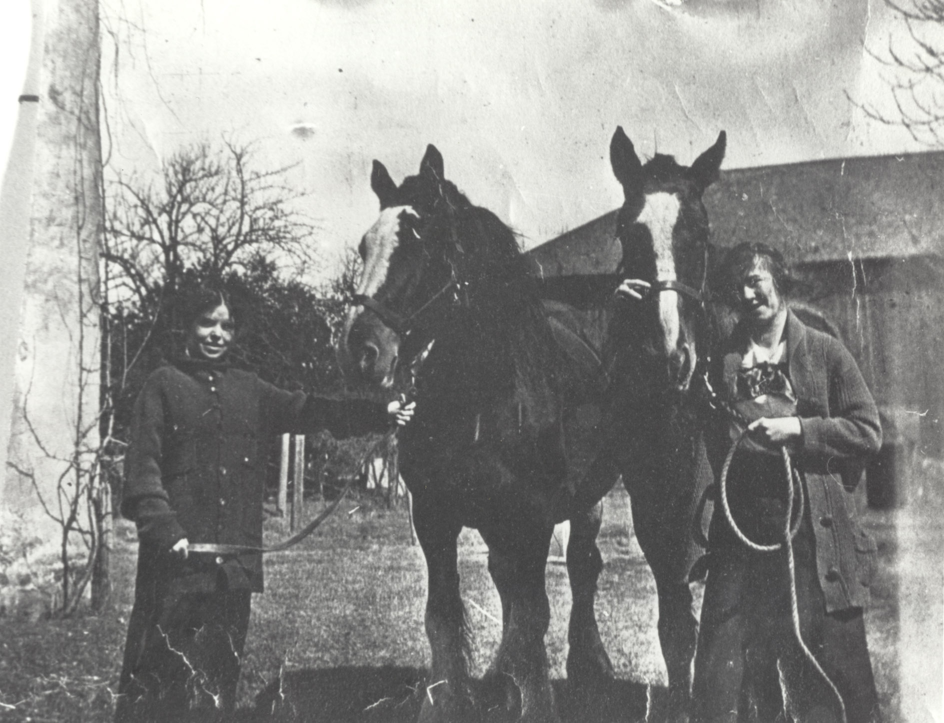 Eva Whan, Zella Reid holding 2 of Beatty's Clydesdales.