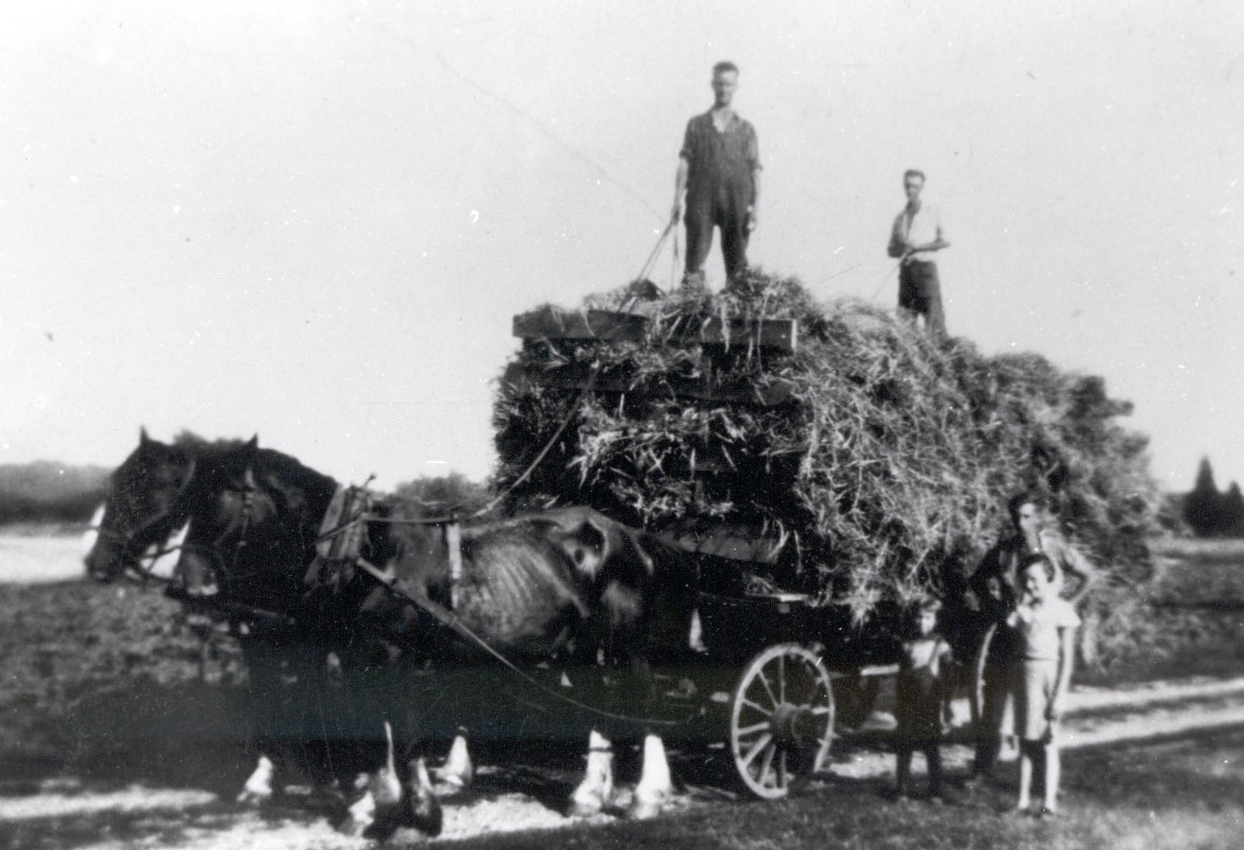 Photo of the hay harvest on the Fred Lucas farm in 1930. The image shows two draft horses pulling a wagon stacked quite high with hay. George Lucas is standing on top of the pile holding the horses' reins with another unidentified man standing at the rear of the wagon. An unknown man and two children, Celestine Graham and Dorothy Lucas, stand beside the wagon.