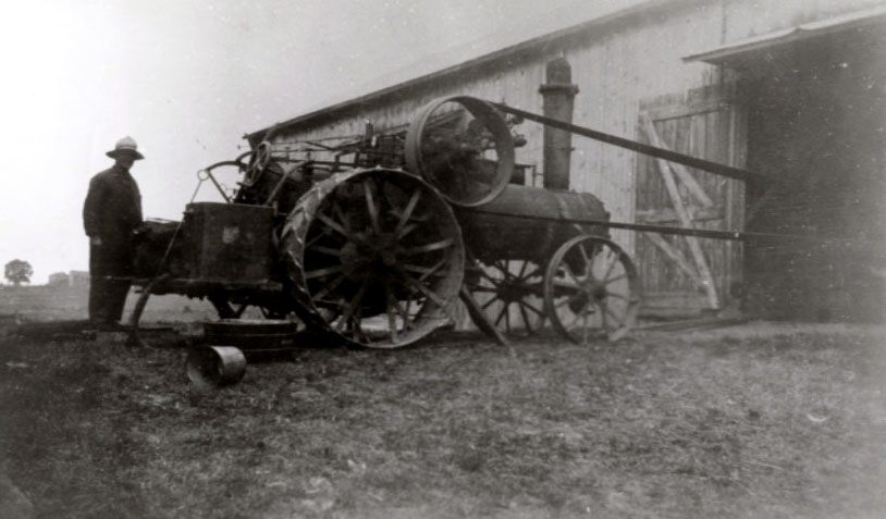 Threshing at Mr. Don Beatty's grandfather's farm. John Beatty, man beside machine unknown. He could be Mr. Art King, he owned the machine.