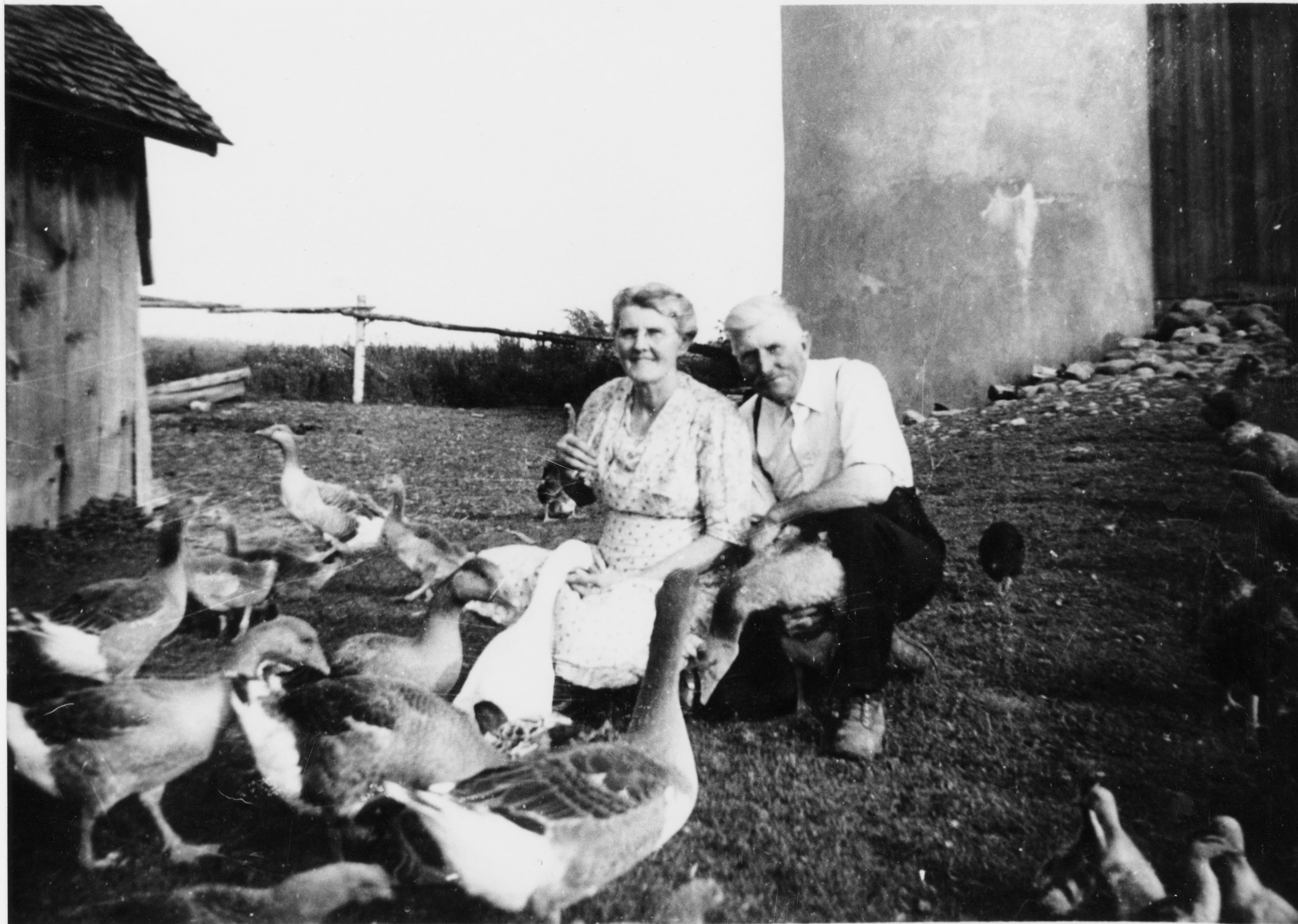 Photo from 1930 of Mr. and Mrs. Albert and Annie (née Hopkins) Pratt on their farm, which remained in the Pratt name from 1832 until 1959. Albert's ancestor John Pratt (1792-1861) arrived from Gloucestershire, England in 1832 and his wife, Ann Smith (1801-1851) came to Canada in 1834 with five children: William, Mary, Fanny, George, and Jesse. Two younger sons, John and Henry, were born in Canada. In this photo Albert and Annie are crouched in the middle of the farmyard feeding a gaggle of geese. The edge of a tool shed is visible on the left, and a silo on the right. Annie and Albert had five children, son William (born 11 March 1908), daughter Edith (born 2 June 1910), son Elmer (born 16 November 1913), daughter Helen (born December 1920), and daughter Florence (born 16 February 1923).
