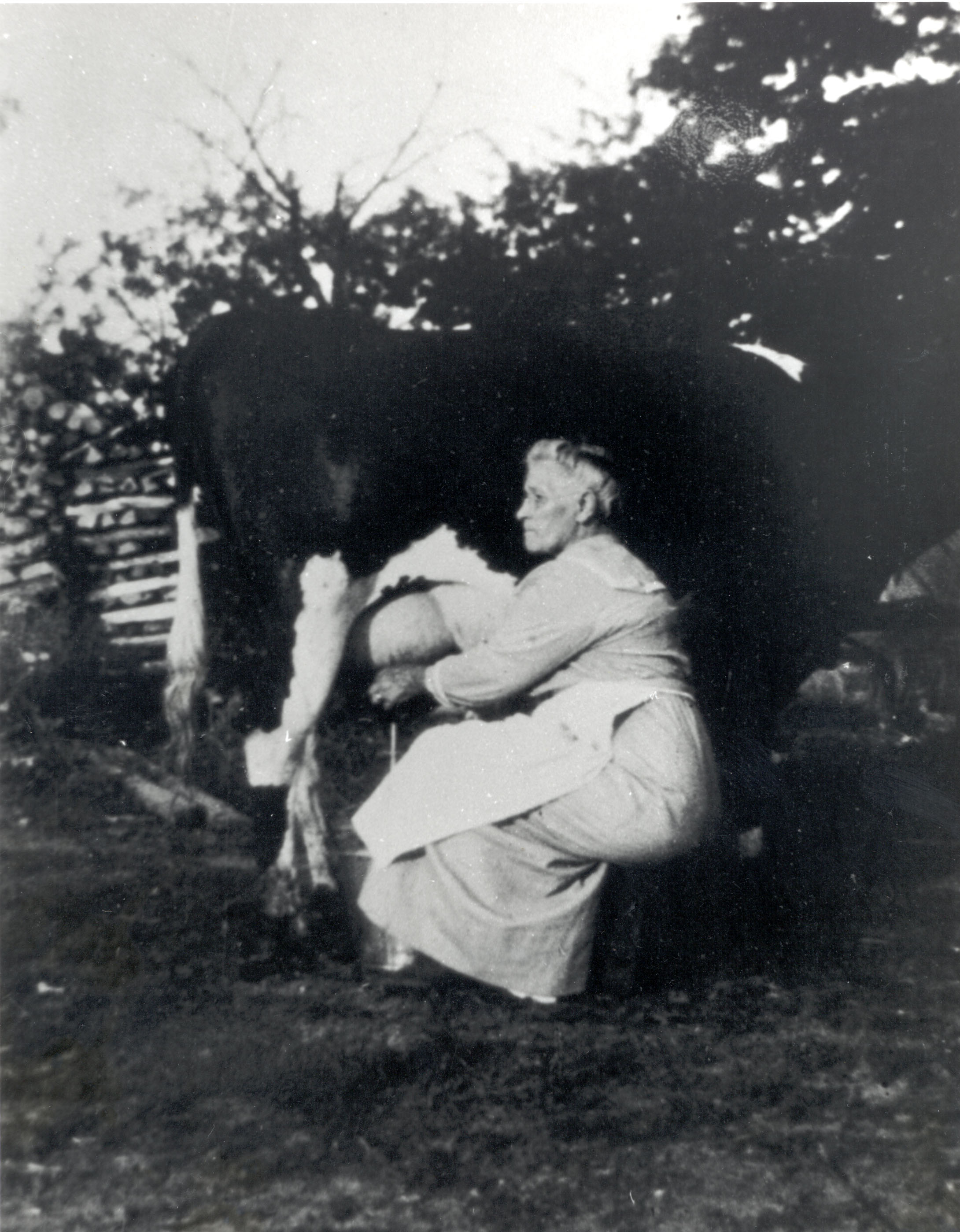 Mrs. Daniel Quantz milking a cow by hand. This chore was typically performed by women.