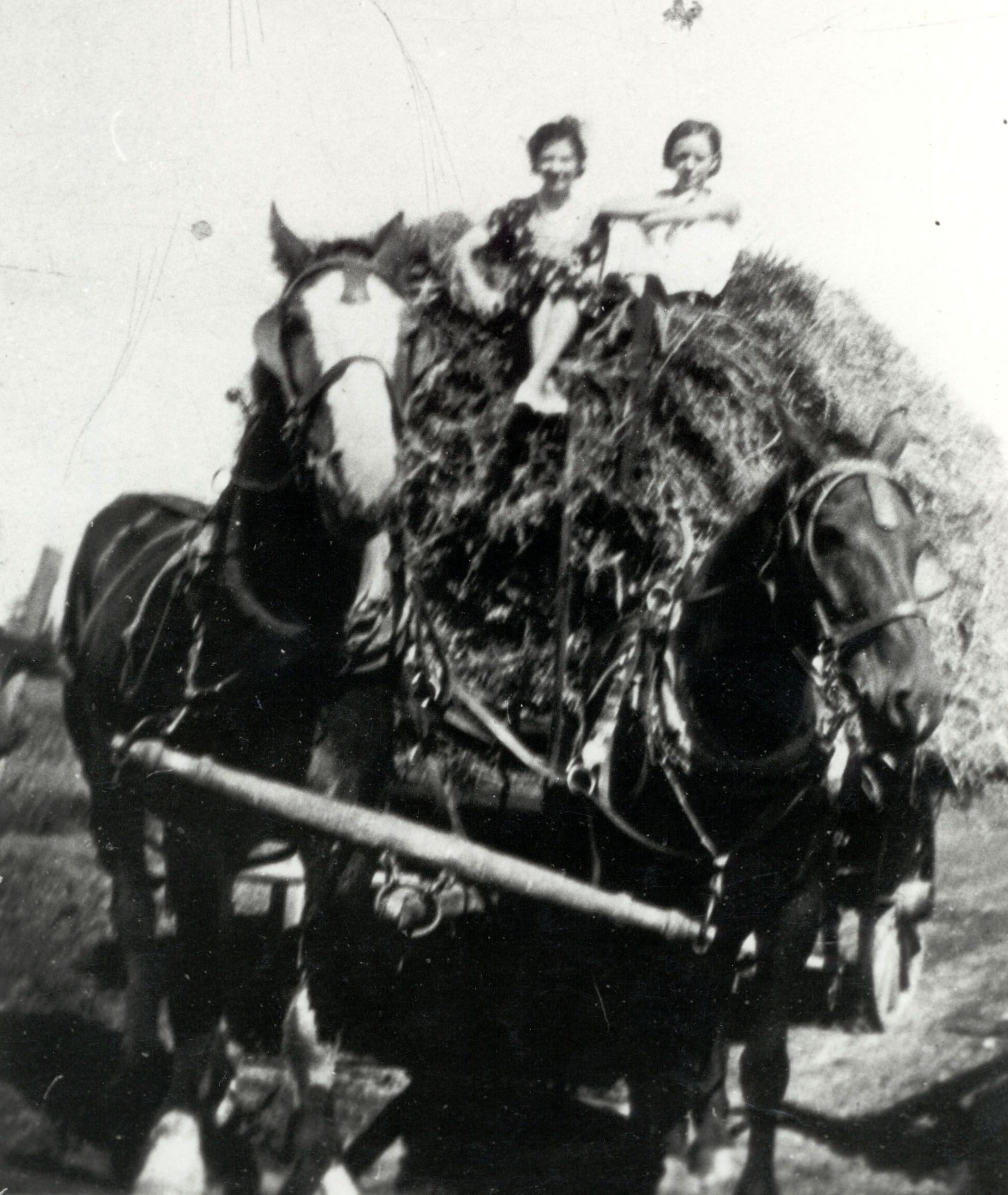 Mrs. Wilson Emrick and Evelyn Emrick on a hay wagon. As transcribed from a tape of a conversation between Don Beatty and John Cowan: "This is a typical load of loose hay, probably coiled in the field and pitched on by hand. It's on the way to the barn. It would be taken off, probably by a hay fork, transferred into the mow for winter feed. I don't know that the two ladies driving it were necessarily driving the team. I think that they just posed for the picture."