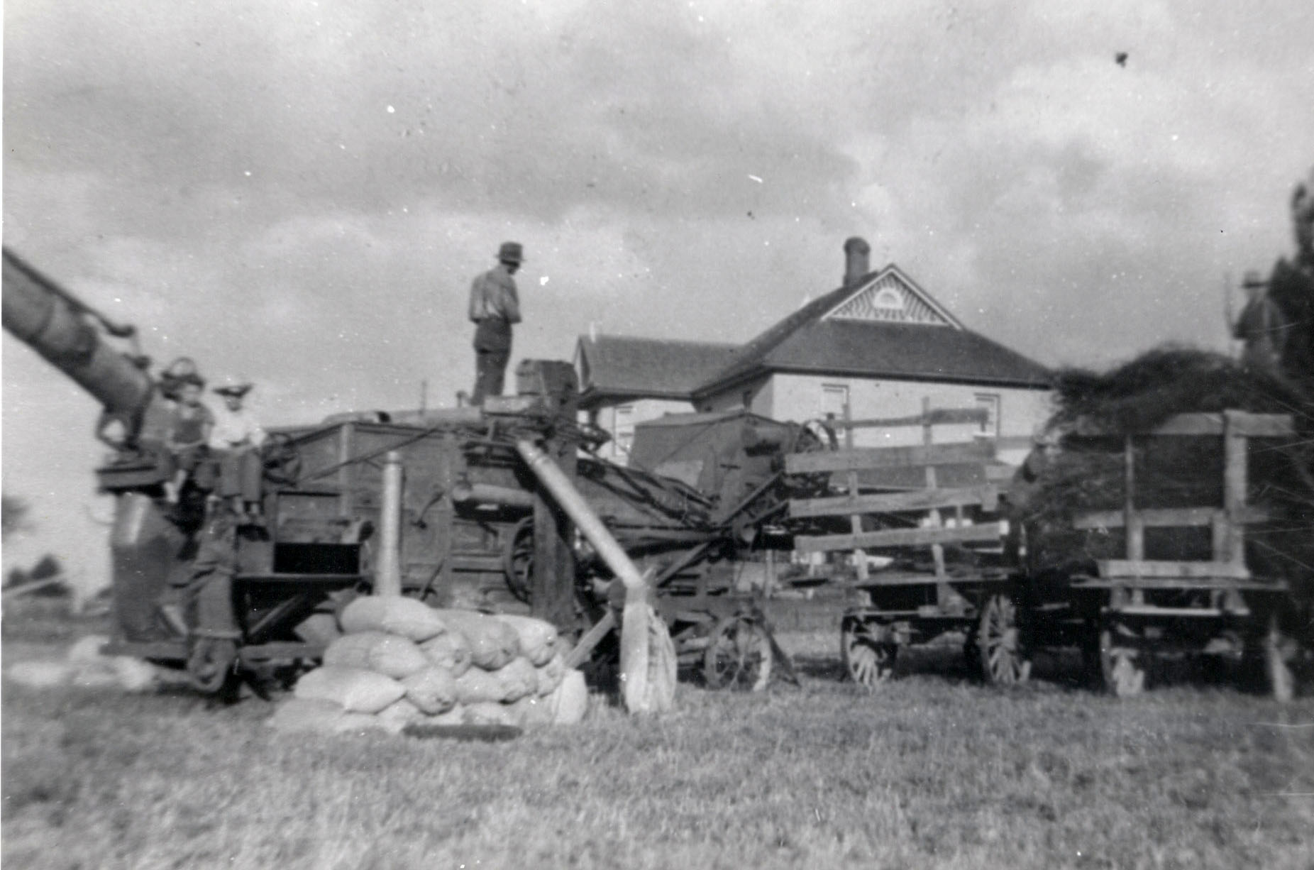 Photo of Fred Lucas in 1940 using a thresher, a device used to separate the head of a stalk of grain from the straw, and separates the kernel from the rest of the head. The photo shows Mr. Lucas standing atop the machine with two young boys seated on the machine near the front. A farmhouse is also visible in the background just behind the machinery.