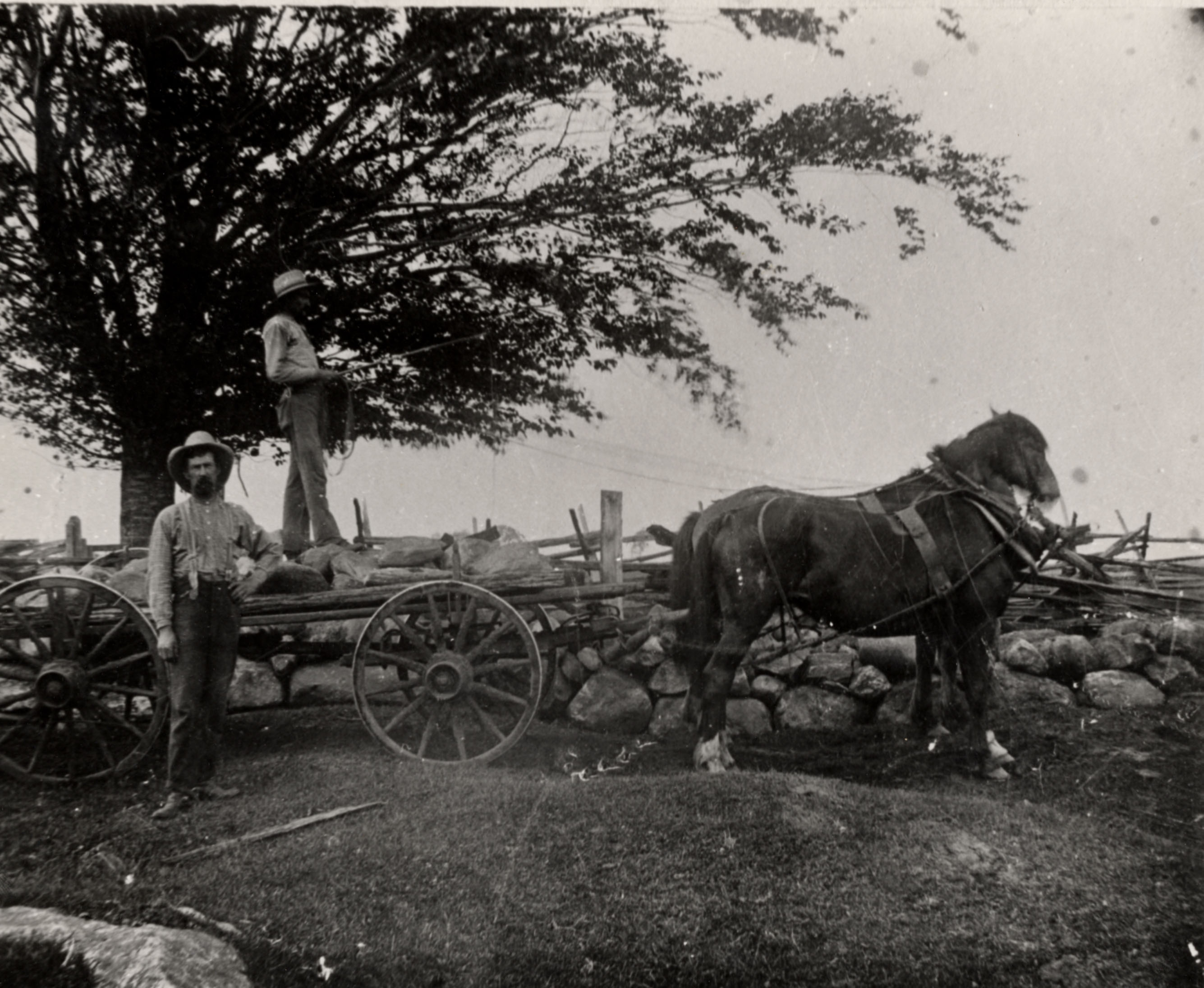 Photo of Isaac Spring II clearing stones with a wagon and team of horses.