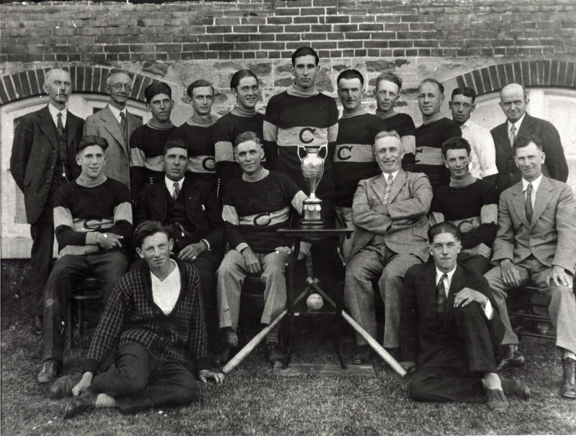 Group portrait of the Churchill Softball Team when they were the 1930 Champions of Simcoe County Softball League. The team members and their management are posed in three rows around a large trophy on a table in the centre. They are dressed in their team jerseys, which are two-toned long-sleeved shirts with the letter "C" written in the centre while the administrators are wearings suits. Pictured from left to right, back row standing: Secretary J.B. Lawrence, unknown, Lloyd Graham (left field), Harry Sloan (sub), Mac Stewart (second base), William Constable (first base), E. Wonch (third base), Ralph Reive (short stop), George Constable (right field), Gordon Browning (centre field), and Vice-President Fred W. Allan. Centre row, seated: Jack Constable (catcher), Manager Herb Graham, Marshall Reive (captain), President Howard Allan, Jack Reive (pitcher), and Treasurer R.P.Lucas. Front row: Robert "Bobby" Boyes and Mansfield Harrison (mascot).