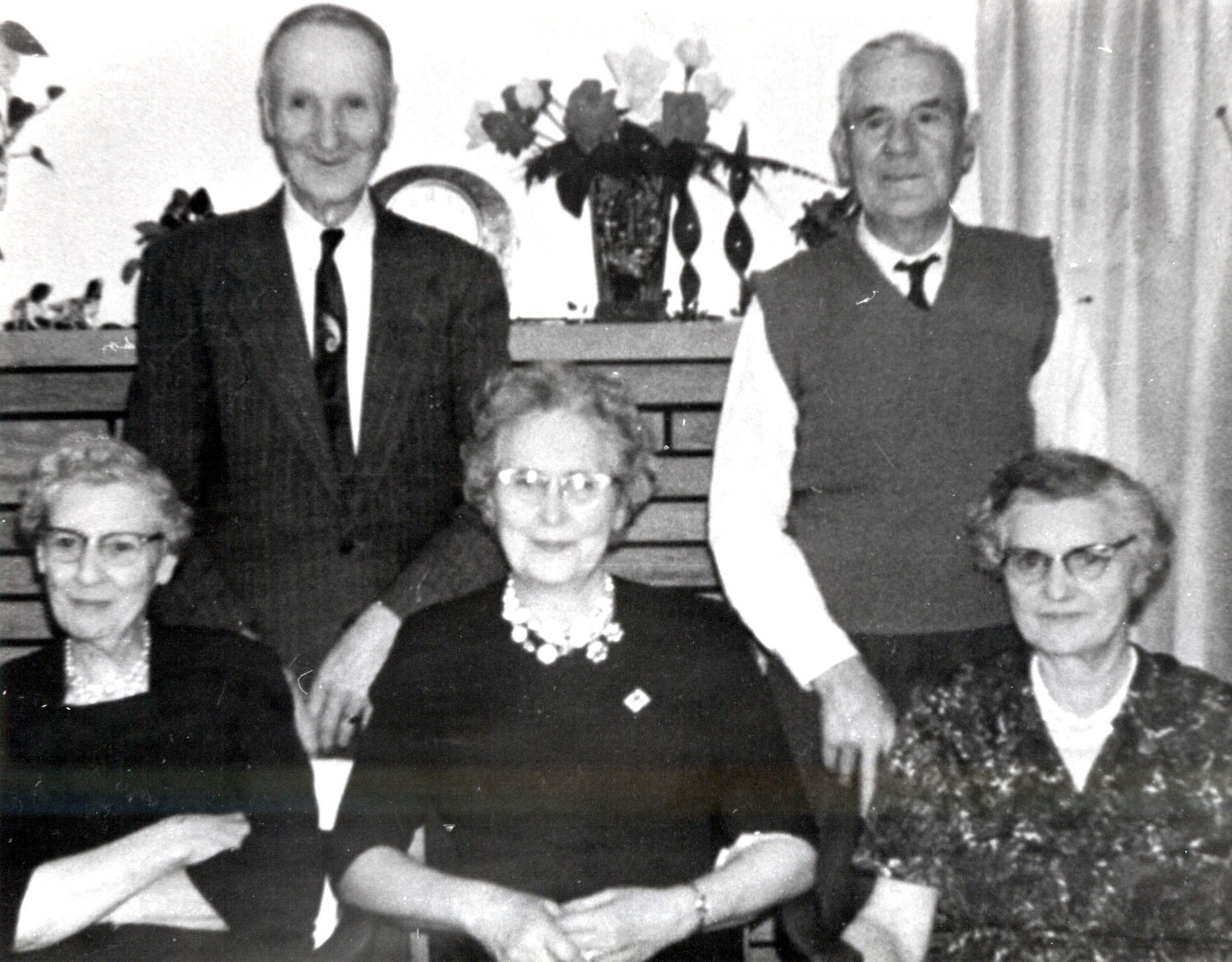Black Family photo from 1960 of five siblings posed in front of a mantel. Pictured from left to right, back row: Alex and Herbert. Front row: Ethel [Flatt], Ina [Clark], and Carrie [McDonald]. They are the children of Robert Black and Margaret Fagan, grandchildren of Robert Black Sr. and Margaret Booth, and great-grandchildren of James Black and Mary Latimer, pioneers of Innisfil who migrated from Ireland in 1847. The three ladies are seated and wearing dresses while the gentleman are standing, with Alex in a suit and Herbert in a sweater vest. A third brother, Wilbert, had passed away in 1946.