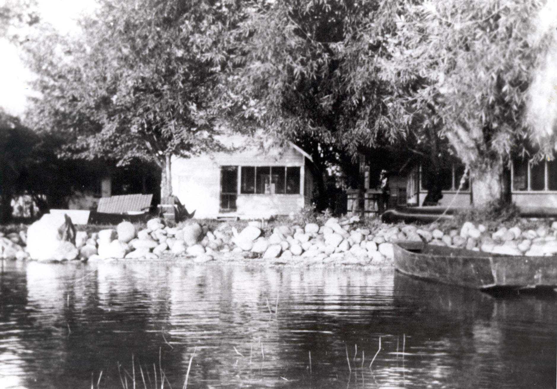Black and white photograph of Bayview Beach after the construction of the Dempsey home cottages. See http://www.ourstoriesinnisfil.ca/fedora/repository/ourstories:1786 for a pre-construction photo.