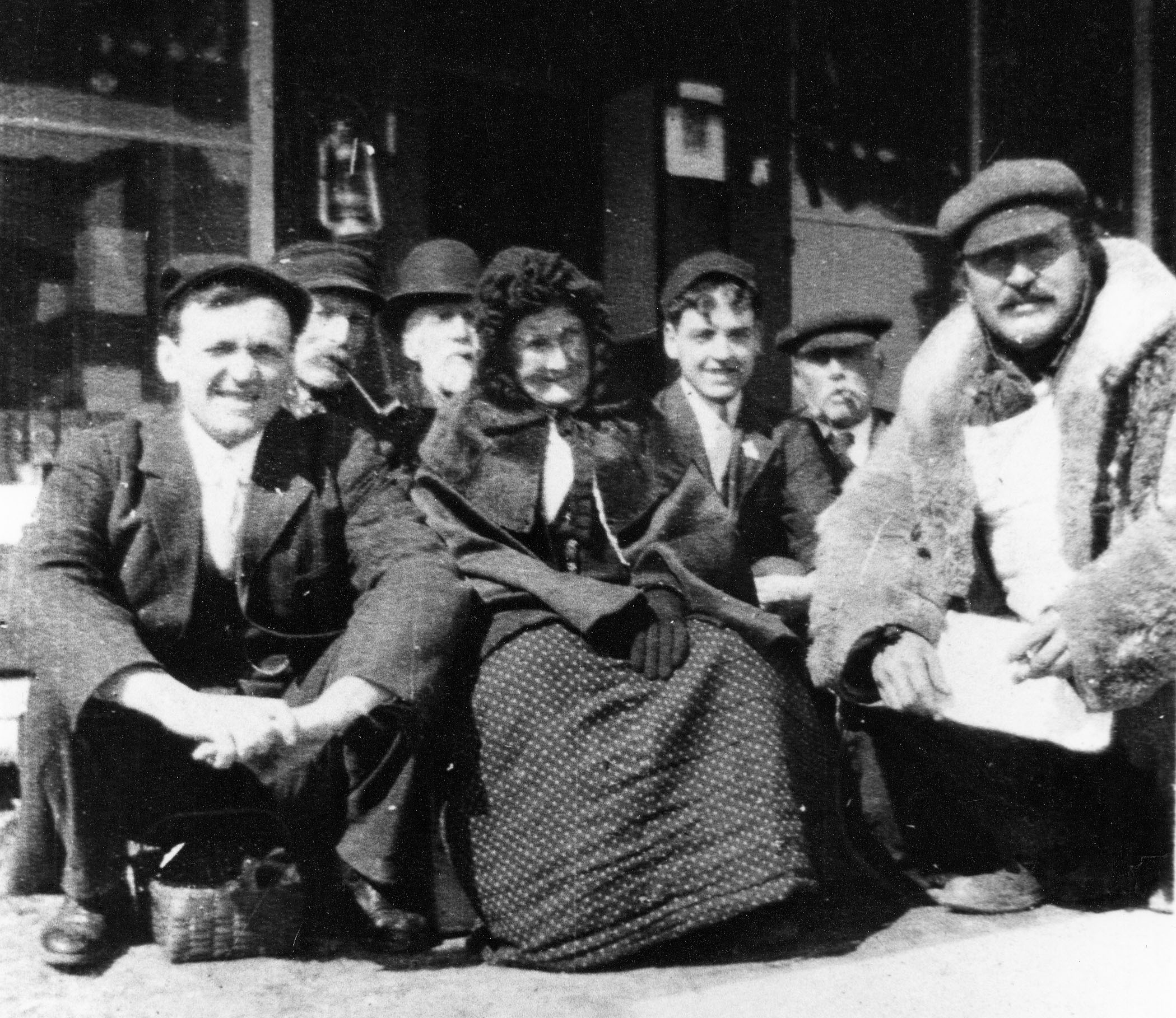 Group photo taken outside of the Village store - northwest corner, owned by Harry Albrecht. Front Row: (left to right) Harry Albrecht, Ann Short, Adolphus Trombley (butcher). Back Row: Dr. Langtry Sloan, Robert Reive, Hewitt Latimer (store clerk), R.W Sloan (carriage maker).