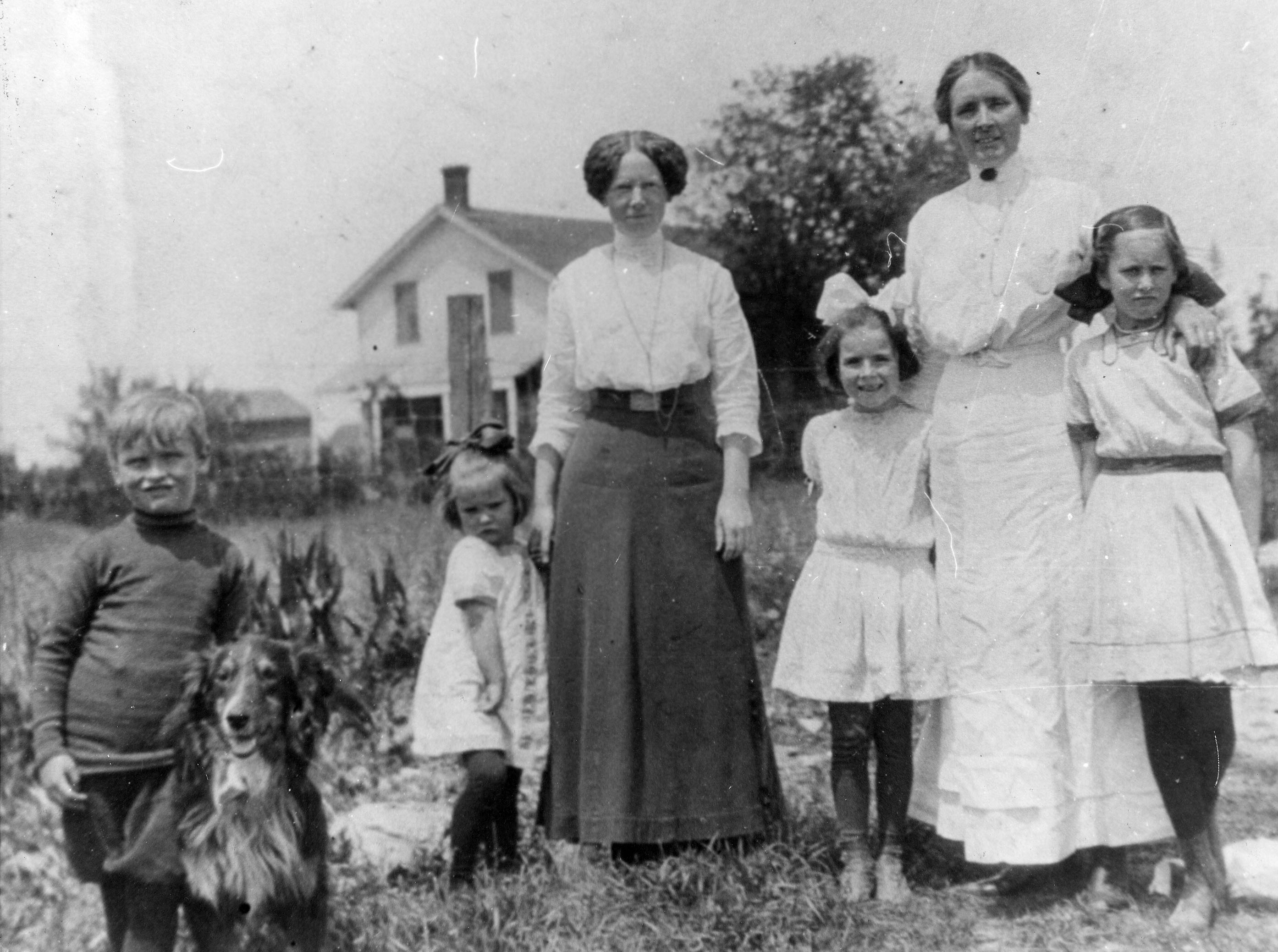 Photo of some of the MacKay family standing on the grassy field in front of Webster's Store in Belle Ewart on the corner of Goldie and Arnold streets. Pictured from left to right are: Finlay MacKay, Mac the dog, Jean MacKay, Miss. Brooks (school teacher), Ellen MacKay, Mrs. F. S. MacKay (mother), and Phyllis MacKay. The three girls are wearing knee-length dresses and bows in their hair while the two women are dressed in long skirts with long sleeved blouses, and the photo appears to have been taken in the summer.