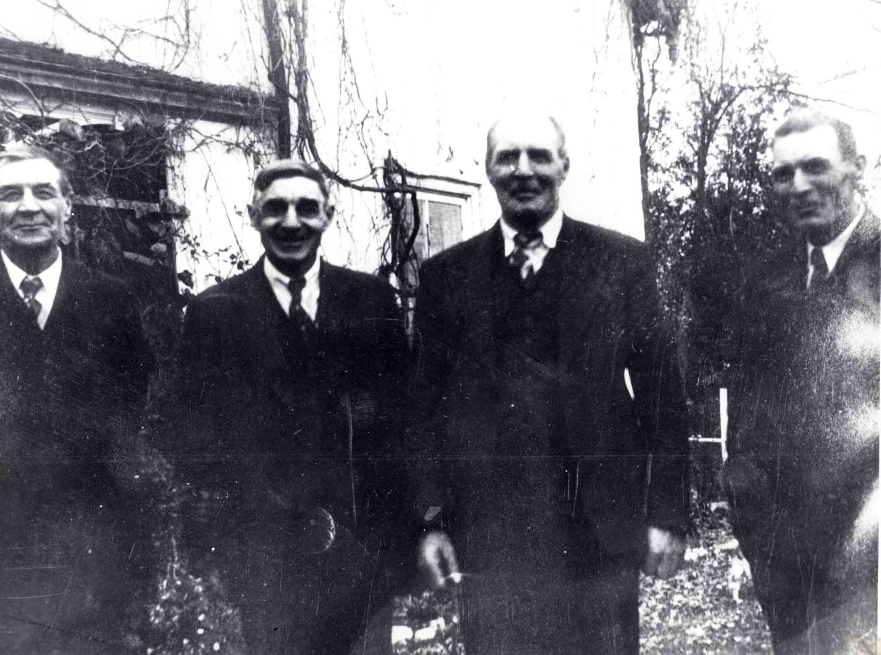 Photo of John Beatty and his family. Pictured from left to right are: John Will, Bob Beatty, Frank Beatty, and Fred Beatty. Frank Beatty (grandson of John) was Reeve of Innisfil in 1937-38 (elected to council in 1929), and Fred Beatty (also a grandson) is the father of Don Beatty, the 1976 president of the Innisfil Historical Society.