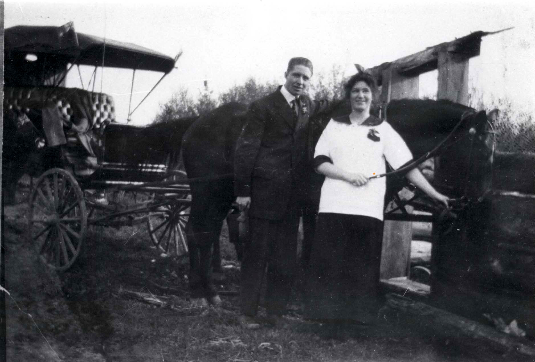 Mrs. Margaret Marshall (née Barclay), the wife of Stanley Marshall, with a horse and buggy. The man's identity is unknown.