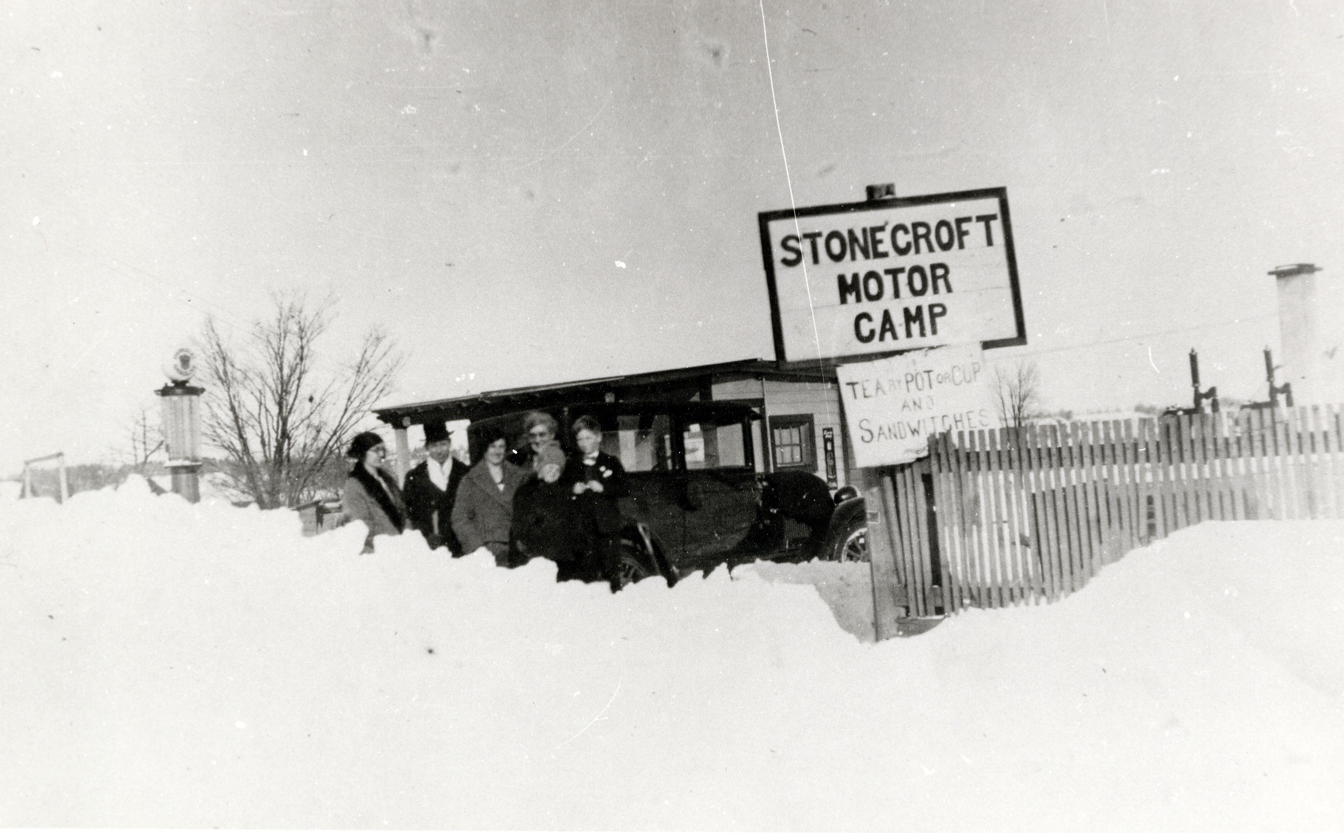 Photo of the Stonecroft Motor Camp in winter with an unidentified group of six people standing in front of it. There is sign announcing the name of the camp with an additional sign below that reads: "Tea by pot or cup and sandwiches." A tall gas pump and black car are also visible beyond the top of the snowbank in the foreground of the photo.