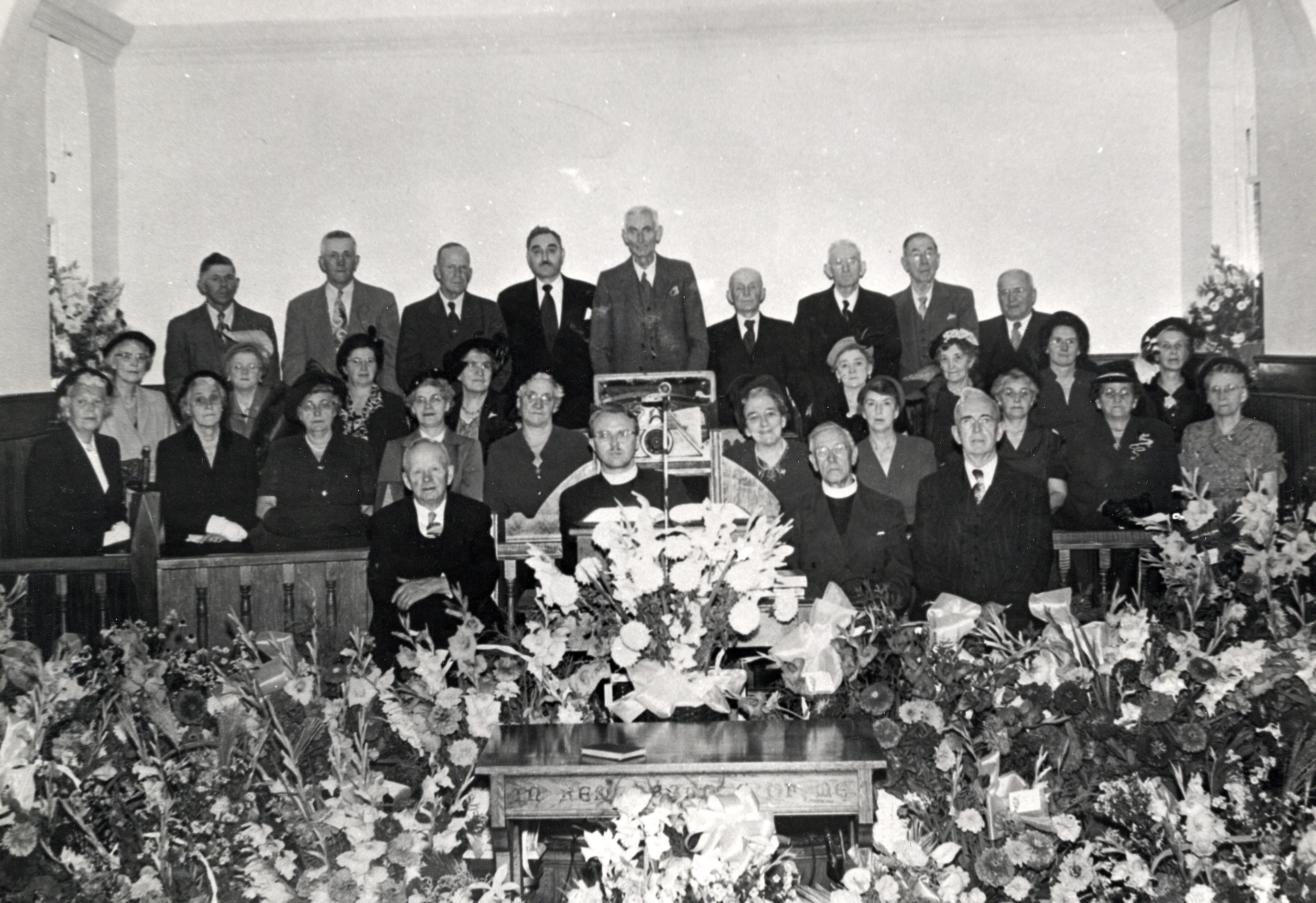 Photo taken on the occasion of St. James United Church's Reunion. Pictured from left to right - Back Row: Cyril McDonald (organist at one time), William Hubbert, Oswald Black, Grant Mayor, Harvey Hughes, Samuel (Sam) Broley, Norman Wice, Herbert (Herb) Wallace, and Wilson Wice. Second Row: Florence (Flora) Neelands, Alice Pratt, Hilda Ferris, Jean Wice, by the Pulpit right Etna Reynolds, Eva Webb, Ruby Cockrane, and Leola McDonald. Third Row Front (l to r): Hazel Neelands, Bell Neelands, Edna Hughes, Evelyn Wright, Addie McConkey (Black), Mrs. Fred Peacock, Jessie Maxwell (Webb), Hilda (Hoover) Wice, Edith (McCraw) Reid, Mrs. Sam Reynolds. Front: Ministers: unknown, Rev. Mr. Morris, Rev. W.R. Clements.
