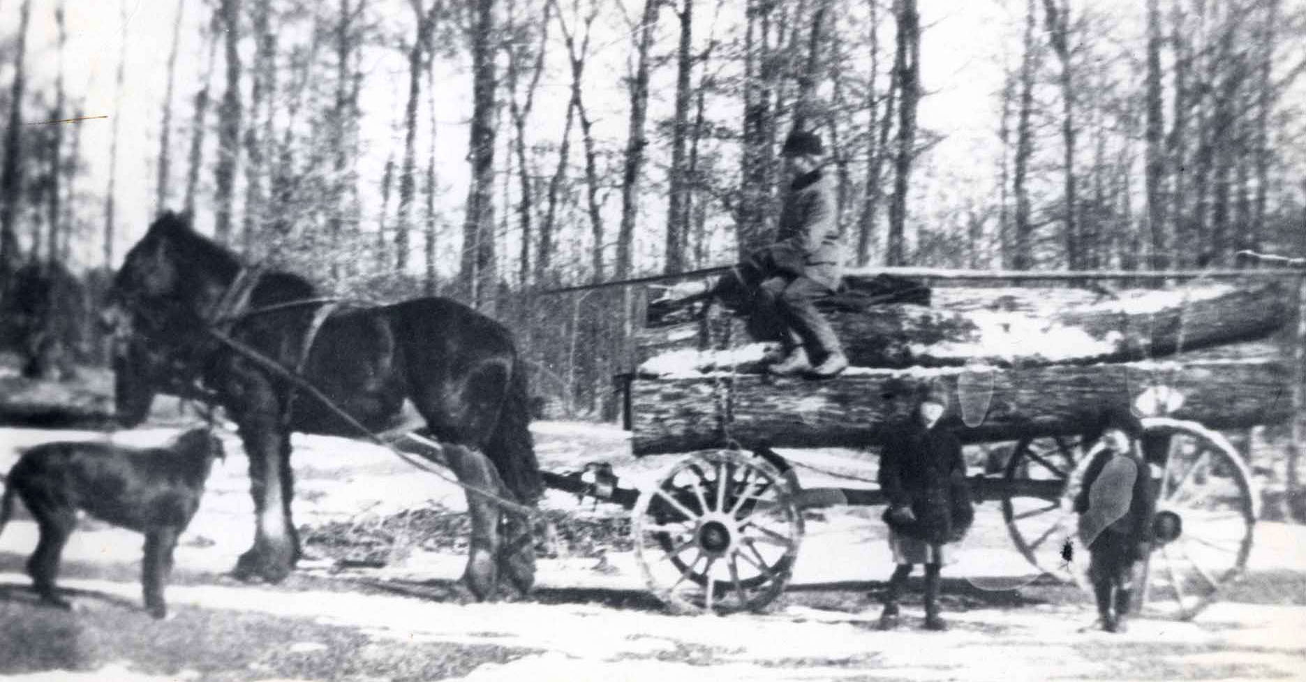 Standing are Roy Goodfellow and Isabel Goodfellow (now Mrs. Isabel Jacks) on the farm of W. J. Goodfellow, 9th line, 1907. Driving is Frank White, the hired man.