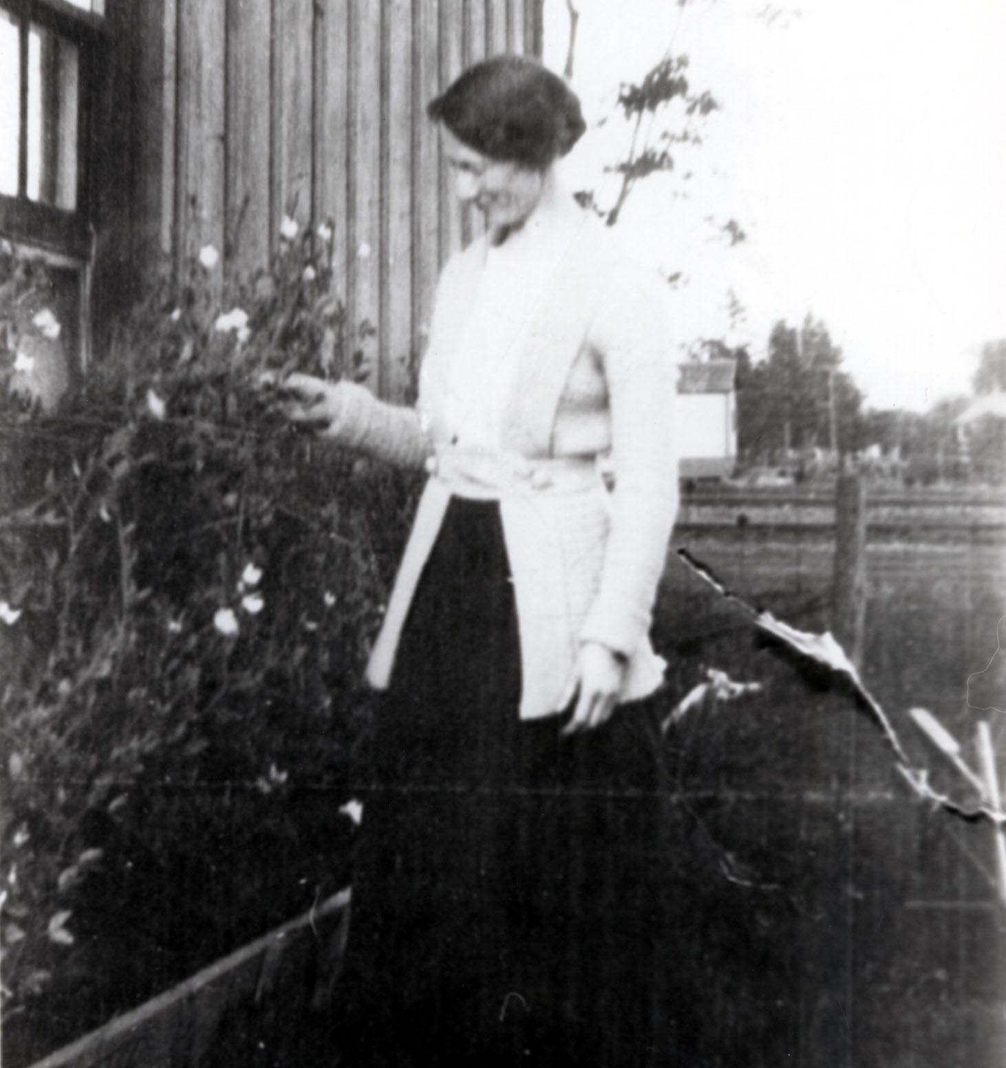 Photo of Margaret "Mayme" Elizabeth Black, taken outside of her own home in Stroud. Mayme was born in 1885, married Oswald R. Black in 1919, and died in 1966. Both her maiden and married surnames were Black as her husband was a relation from a different branch of the pioneering Black family of Innisfil. Mayme was the daughter of James Black and Mary Lennox, granddaughter of Robert Black and Margaret Booth, and great-granddaughter of James Black and Mary Latimer, who emigrated to Innisfil from Dungannon Ireland in 1847. She was a regular contributor to the Stroud news. She is pictured here in 1921 with dark hair wearing a light coloured cardigan and inspecting some flowers growing next to her house
