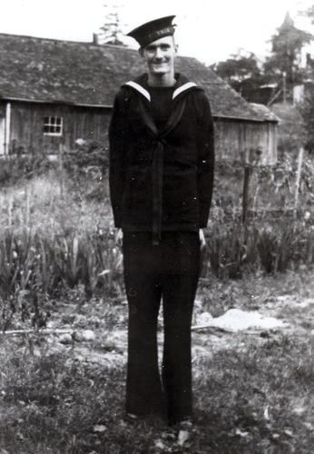 Photograph of Byard Donnelly, a sailor in the navy in the Second World War. In the background is the old Churchill Curling Rink, built by Davie Lennox in 1900 and purchased by Edward Sloan in 1909. It was located on Pt. Lot 16 - Village Plan 162 (Pt. Lot 10).