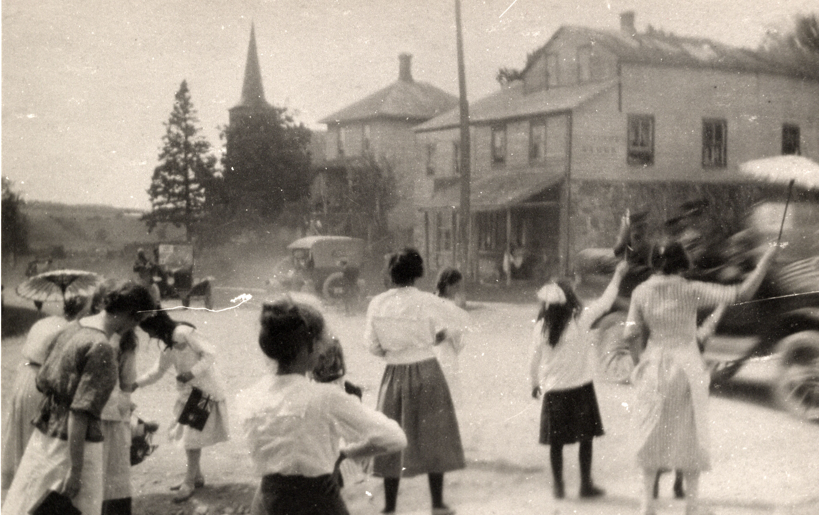Photo of girls celebrating the arrival of a parade coming up from Toronto. Also visible is the old Sloan building on the southwest corner.