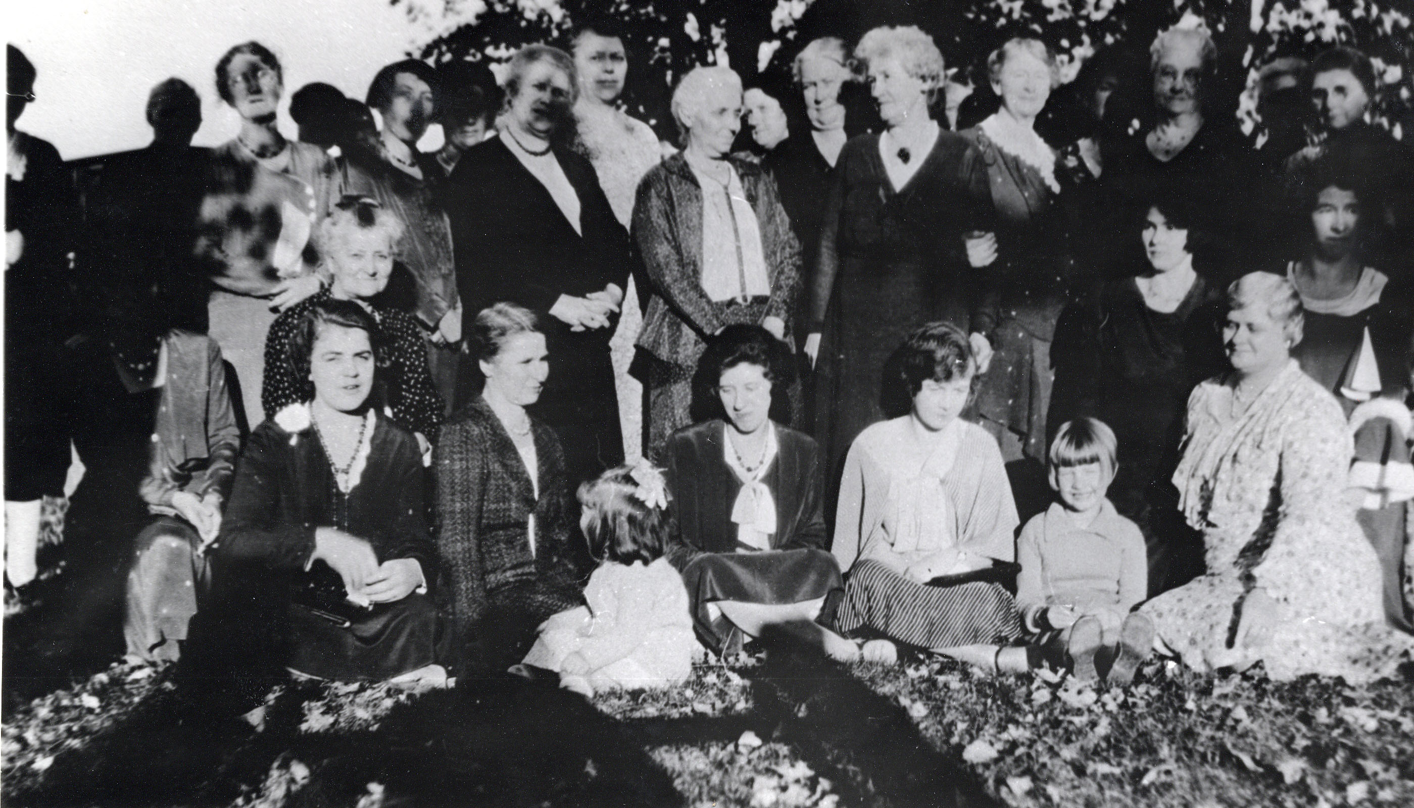 Group photo of the Women's Missionary Society in Churchill. Pictured from left to right - Front Row: Mrs. Allan Todd (first wife, Mary Reid), Mrs. Harvey Ralston with Myrna Todd (child) in front, Mrs. Dwight Nelson, Mrs. Norman King, Louise Allan (child), and Mrs. Gavin Allan. Second Row: Mrs. Walter Ralston, Mrs. Bert Bonney, and Mrs. Edgar Sturgeon. Back Row: two unknown, Mrs. Lou Stephens, two unknown, Mrs. Fred Lucas, unknown, Mrs. Irving Nelson, unknown, Mrs. Brant, Mrs. Seymour Kell, Mrs. Sam Todd, Mrs. Robert Boyes, unknown, Mrs. Gilmore Reive, Mrs. Tannahill Sturgeon, and last two unknown.