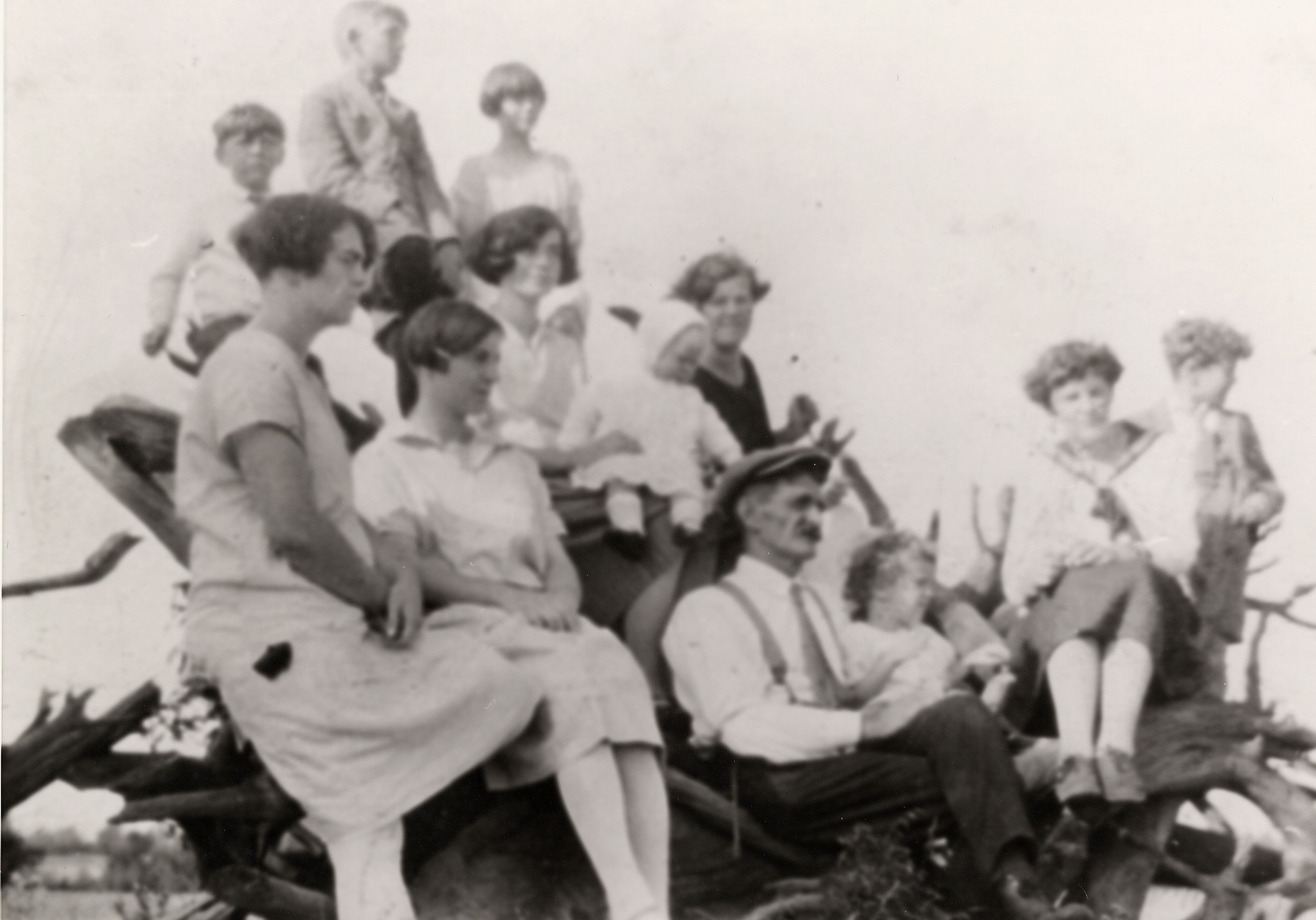 Photograph of the Donnelly Family. Pictured from left to right - Front Row: Zella, Dora, Thomas Donnelly, Byard (in his arms), Edith, and Harvey. Back Row: Francis, Wray, Kathleen, May (Reive), Mary (baby), and Dora.