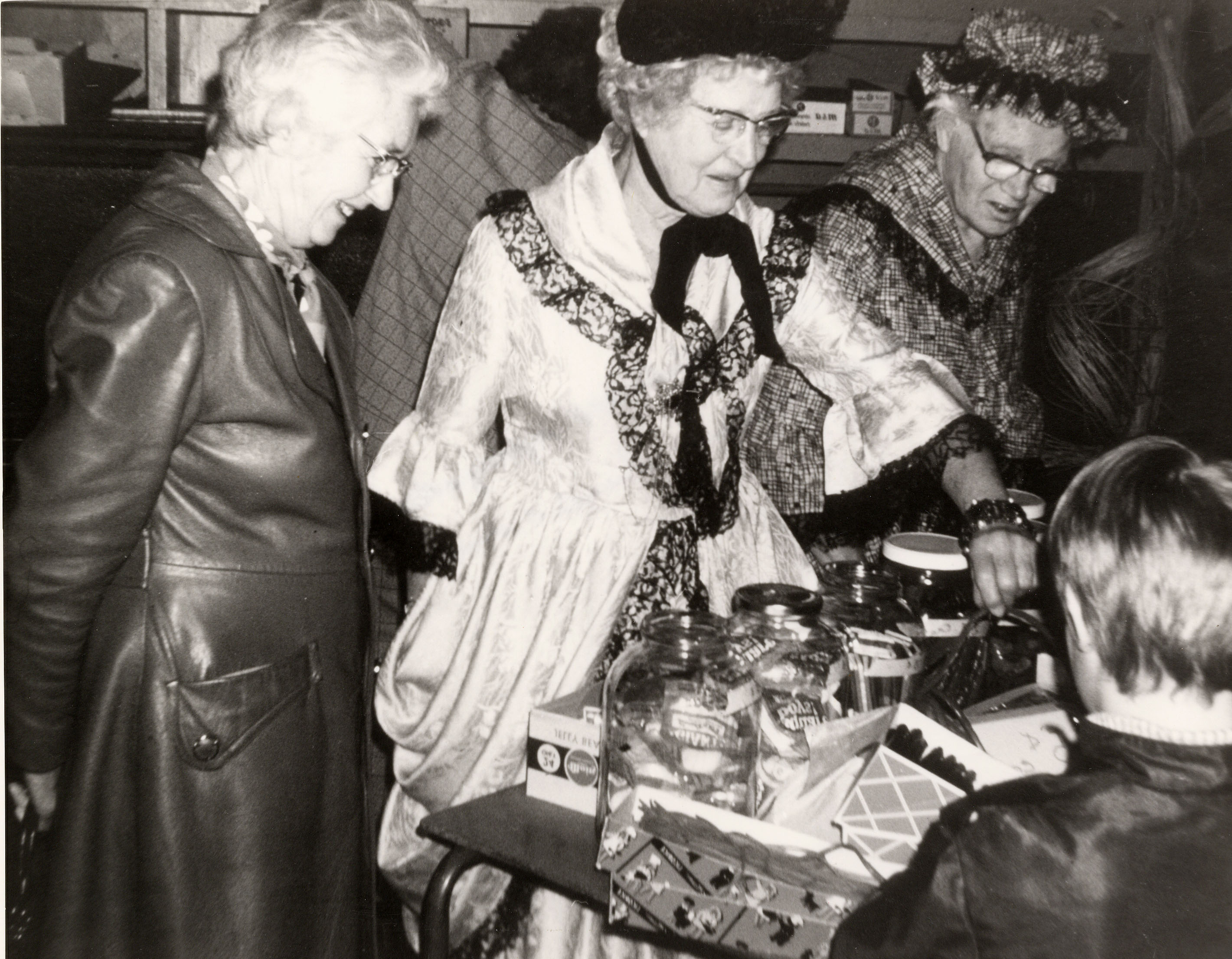 Photo of Isabel Jacks (née Goodfellow) and Clara Goodfellow (née Kell) dressed in period costume while selling candy at a Painswick community fair. The costumes include elaborately designed dresses and bonnets. Helen Warnica stands to the left smiling while an unidentified boy peruses the candy selection.