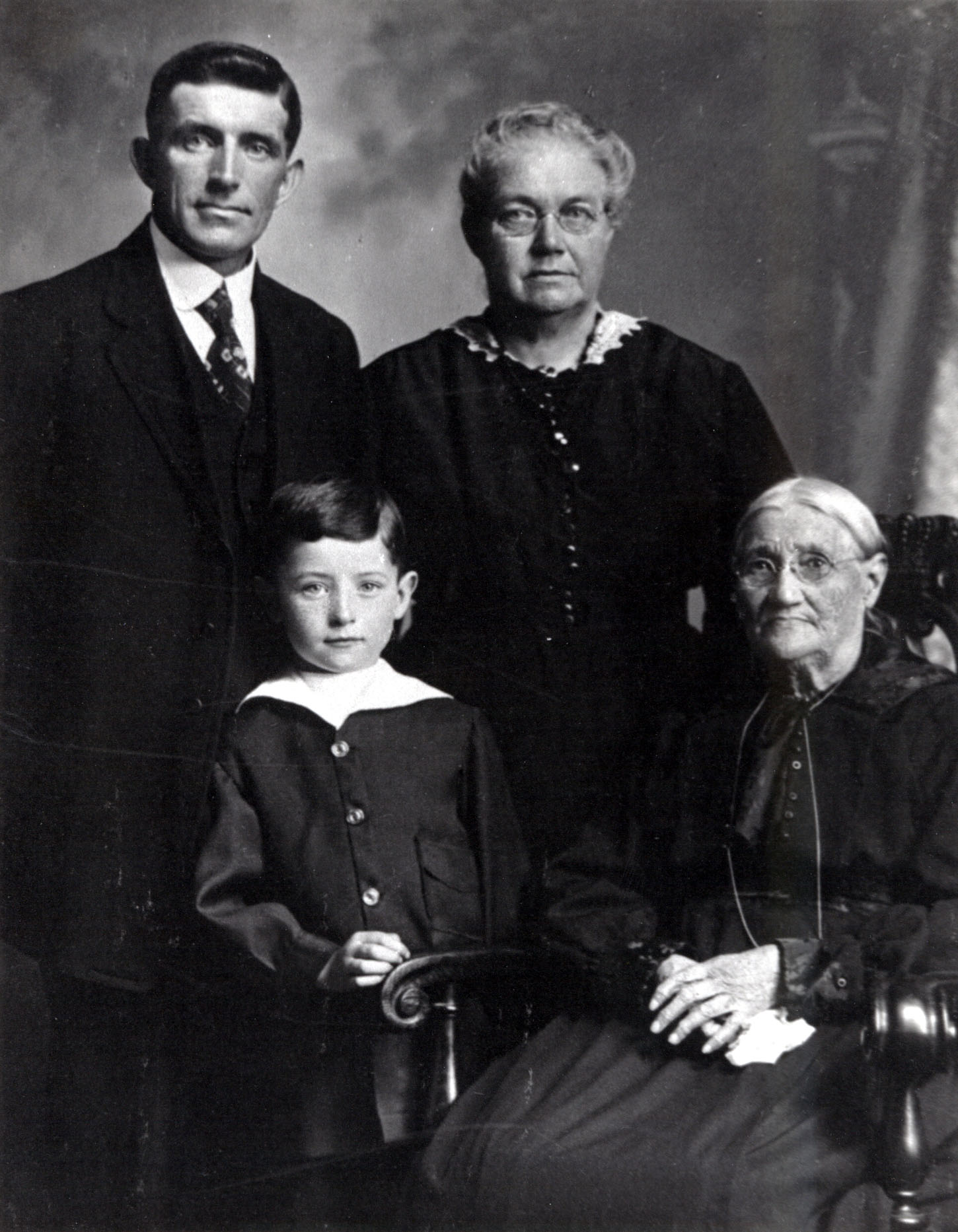 Pictured are: Harry Stewart with son Clarence (b. 1914), Mrs. Robert Stewart (née Monica McCullough, standing), and Mrs. Thomas McCullough (née Elizabeth Sawyer, seated).