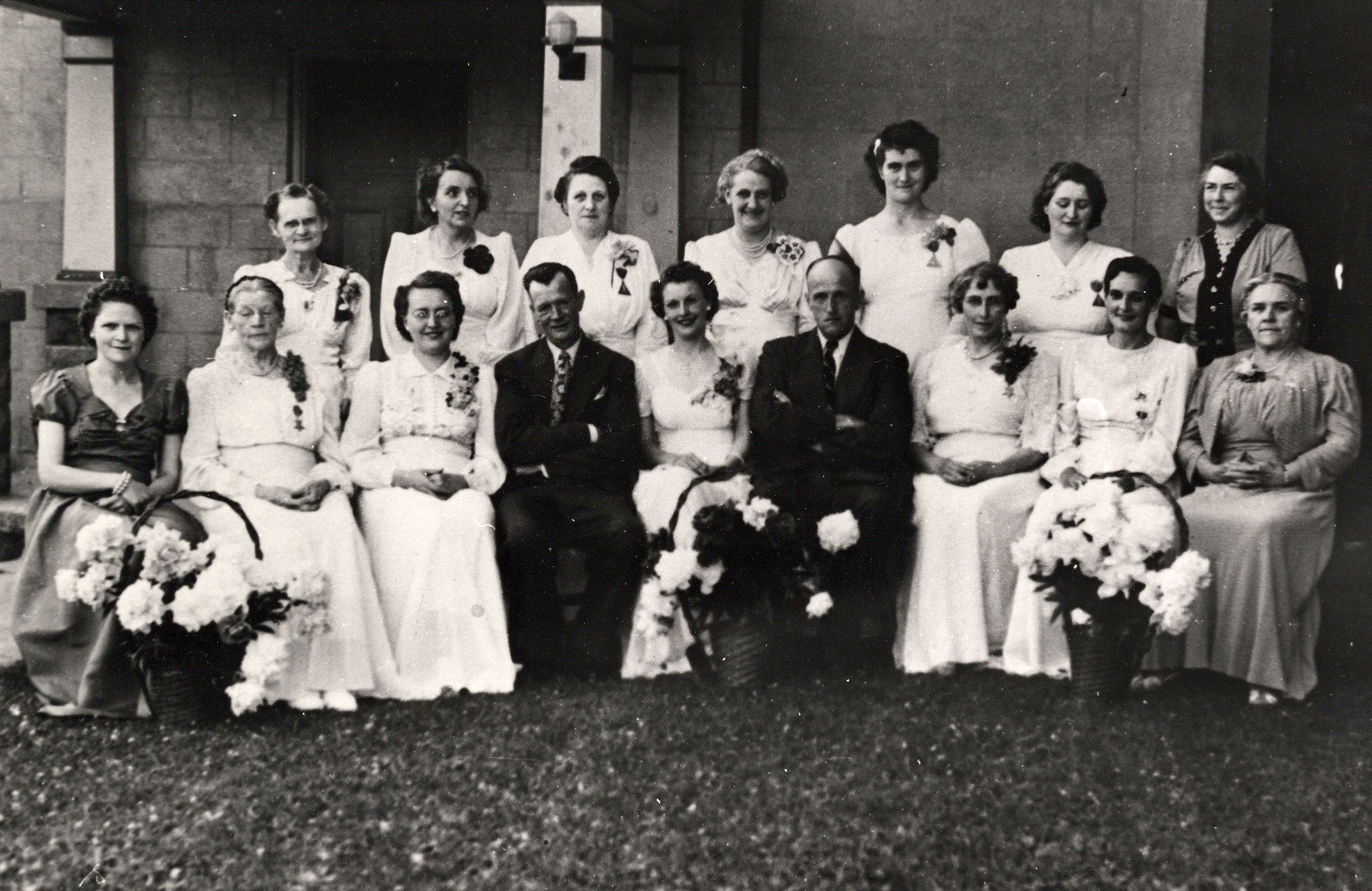 Group photograph of the members of the Order of the Eastern Star. Pictured from left to right, back row: Mrs. Annie Campbell, Mrs. Jessie Jackson, unknown, Mrs. Margery Cowan, Mrs. Joyce Kennedy, Mrs. Jessie Campbell, and Mrs. Dora Webb. Front row: Mrs. Helen (George) Malholland, Mrs. Minnie (Margery) Leonard, (Mrs. Sadie Green's mother), Mrs. Helen (Fred) Mulholland, Mr. William Campbell, Birdie Gordon (mother of Mrs. Lloyd Webb), Mrs. Jean Hand, and Mrs. Laura Shering. The group is dressed formally with the women in long dresses with corsages and the two men in suits. The photo was taken outdoors, in front of a house or building.
