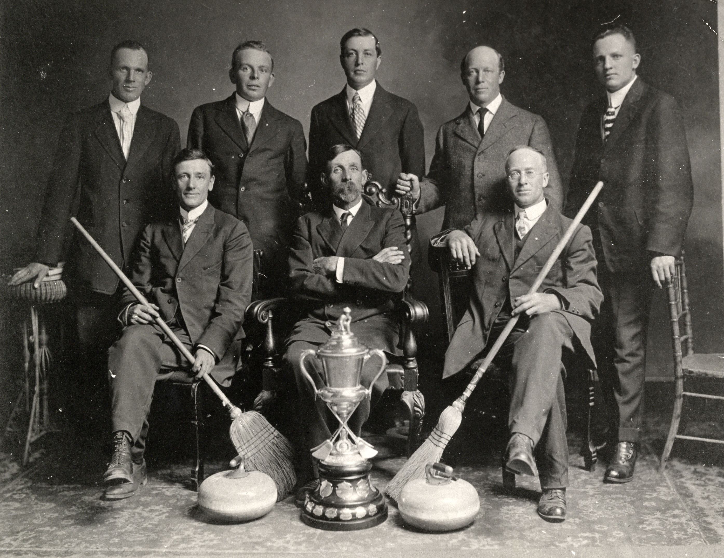Photo of the 1919 Curling team with either the District or Governor General Trophy. Pictured from left to right, back row: Oswald Black, Tom Hissock, Russell Webb, Arthur Green, and Dave McArthur. Front Row: Rev. William Clements, Robert Sutherland, and Benjamin Webb. The eight men are all dressed formally in suits with five standing in a row behind three seated men. Rev. Clements and Mr. Webb are each holding a broom, and the trophy is on the floor in front of Mr. Sutherland. Two rocks flank either side of the trophy.