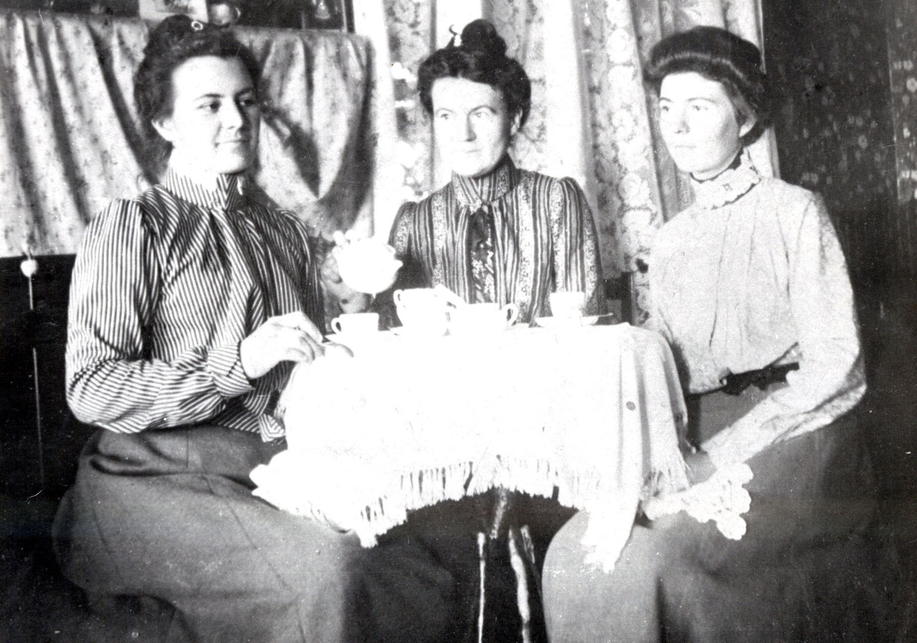 Photograph of Florence Beatty (left, m. Alec McCullough), Lydia Beatty (centre, m. Job Metcalfe), and Jean Donnelly (right, m. Jack Reid) having tea.