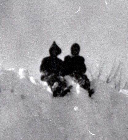 Two figures sitting on top of the giant snowbanks after a large snowstorm.