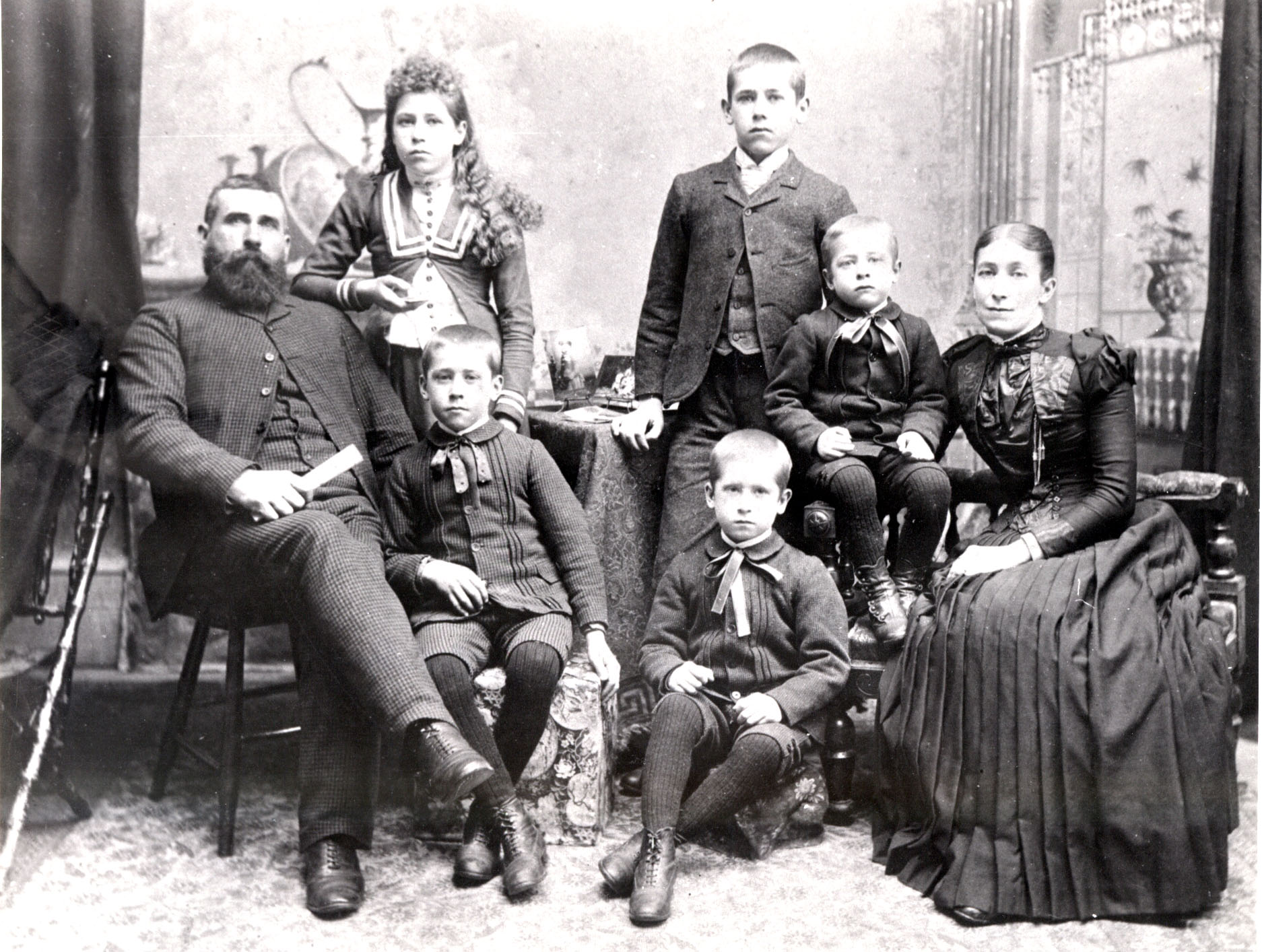 Pictured from left to right: Elijah Hughes, Eveleen, Edward (seated, front left), Frank (standing), Wesley (seated, front right), Harry, and Alice Hughes. All children were raised on the family farm on NH Lot 18, Conc. 1. The farmhouse was built c. 1880.