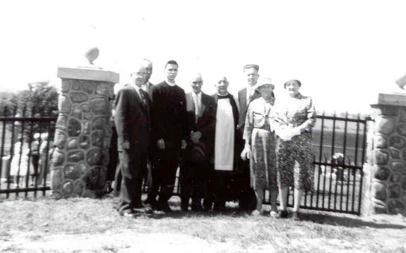 The members of the cemetery board to whom the Rev. Mr. Adam expressed thanks, from left to right: Murdoch McCuish, Earl Carr, Rev. J. Adam, Frank Broley, Rev. Wallace Downer, Robert Riley, Miss Sara Slight, Mrs. Elisabeth Donnell, and Arthur Hansen (not present).