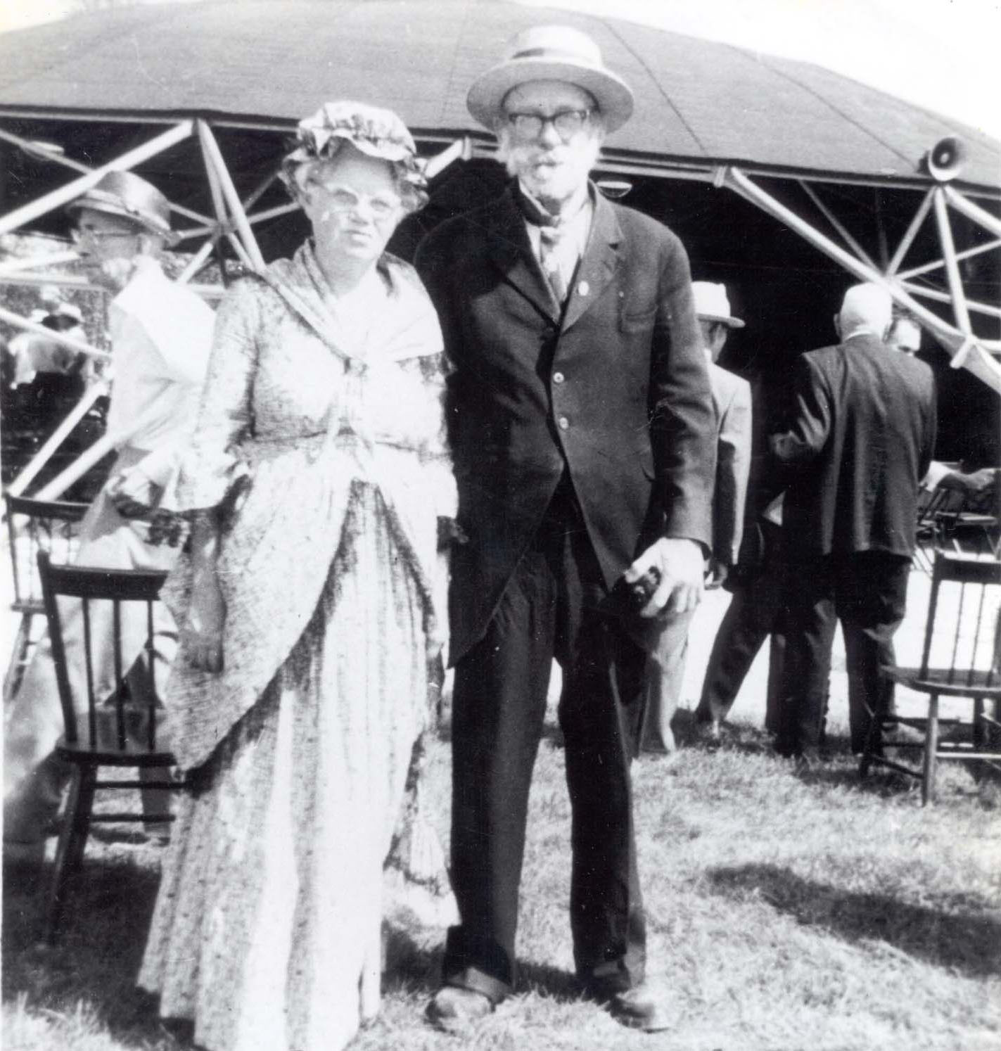 Photograph of Clara and Roy Goodfellow wearing period costume of the nineteenth century at Innisfil Centennial Park for Canada's Centennial celebrations, 1967. Clara is wearing a long patterned dress and bonnet, and Roy is wearing a dark suit and boater hat. A number of people are visible in the background milling in and out of the park's pavilion.