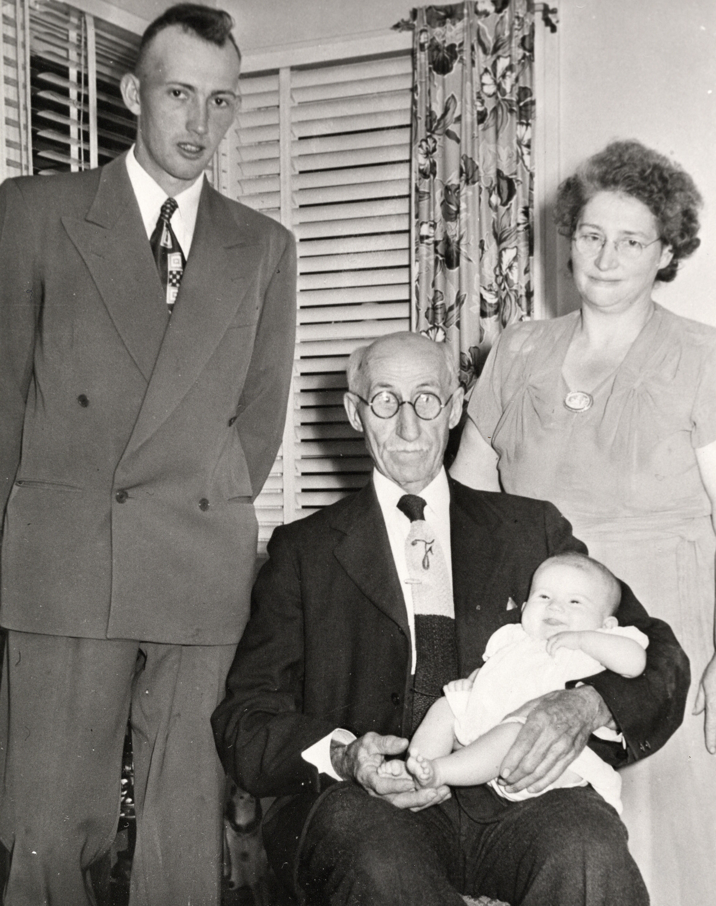 Family photo of Fraser Campbell (left) with his daughter Ann Campbell who is being held by his grandfather David Fraser. Mrs. W.W. Campbell, Fraser's mother, is standing on the left.